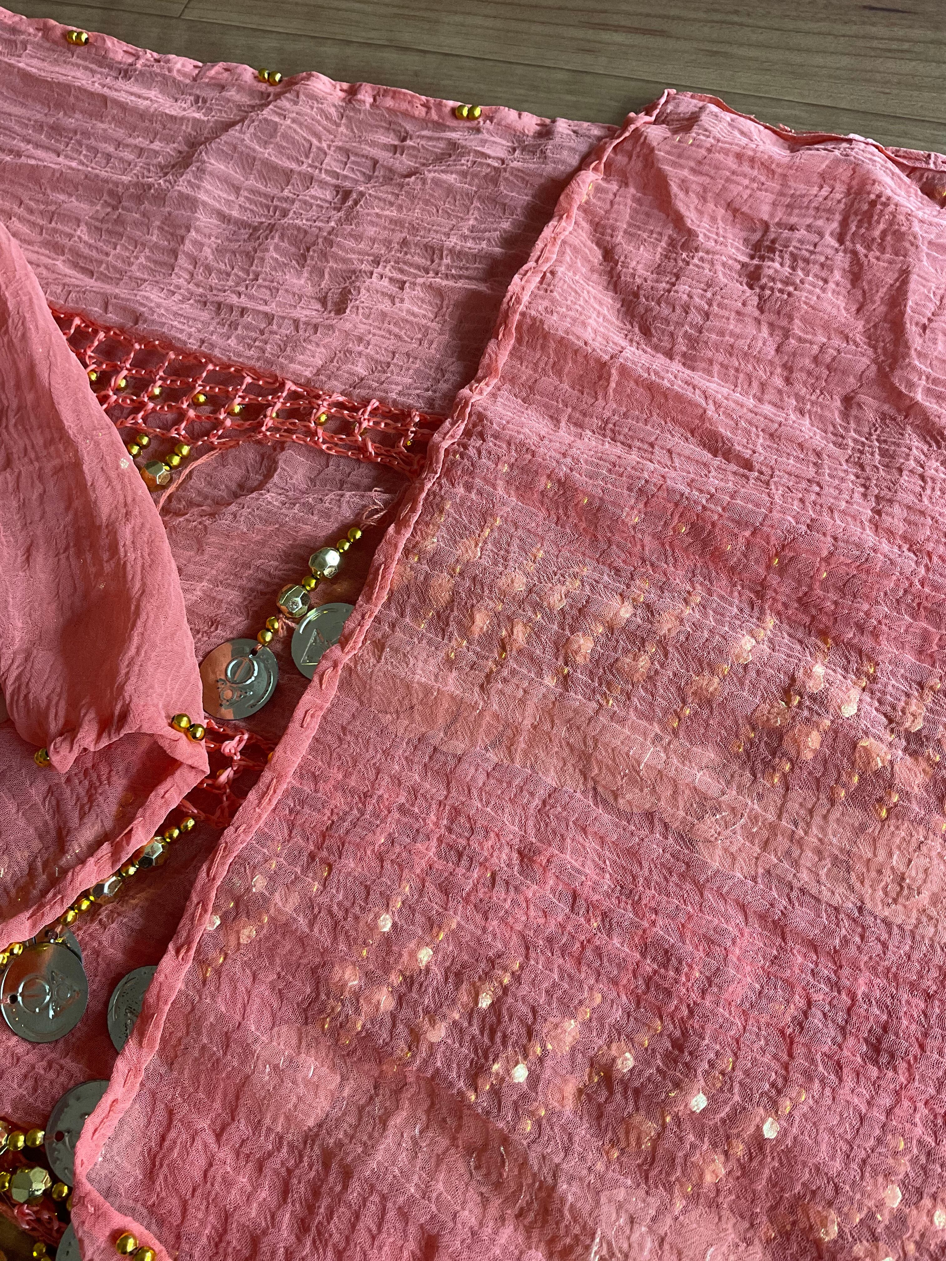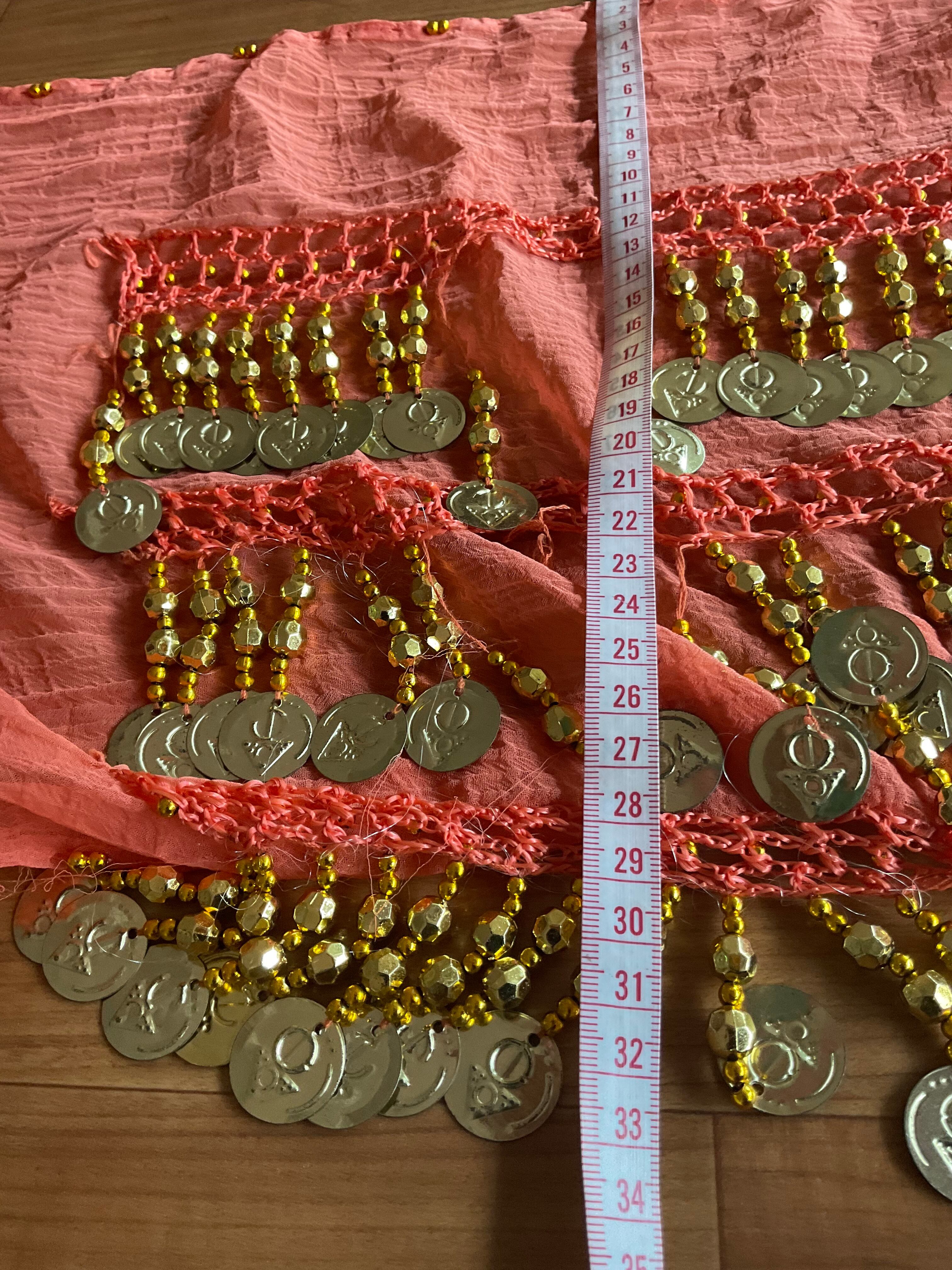 魅力的なオレンジ色と金色のコインが施されたベリーダンスヒップスカーフが中古品として新たに登場です!インド製で、本格的なジプシーダンスやオリエンタルダンスに最適な一品です。あなたのダンススタイルに華やかさをプラスすること間違いなしです。