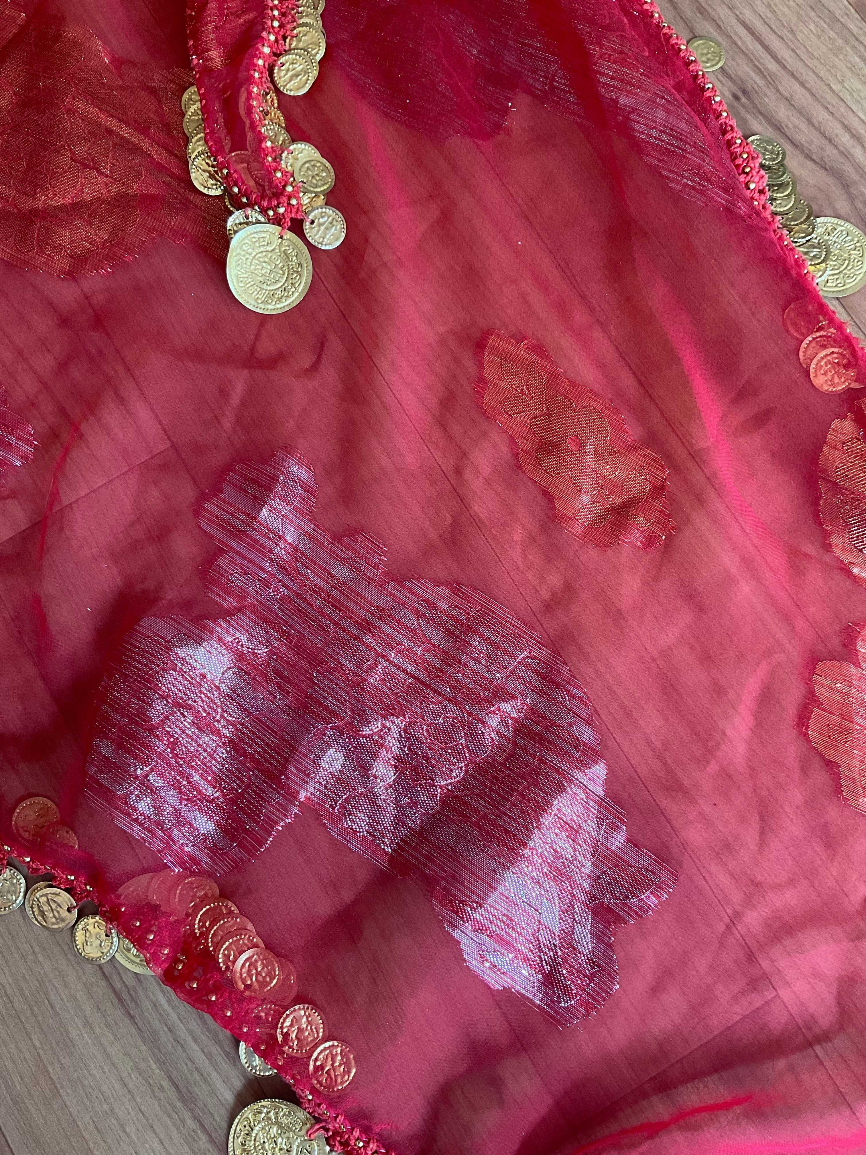 コインの心地よい音が鳴る、ベリーダンス、ジプシーダンス、コスプレやパーティーに最適なとても美しいベルトです。明るい赤に光沢のある金と銀の模様