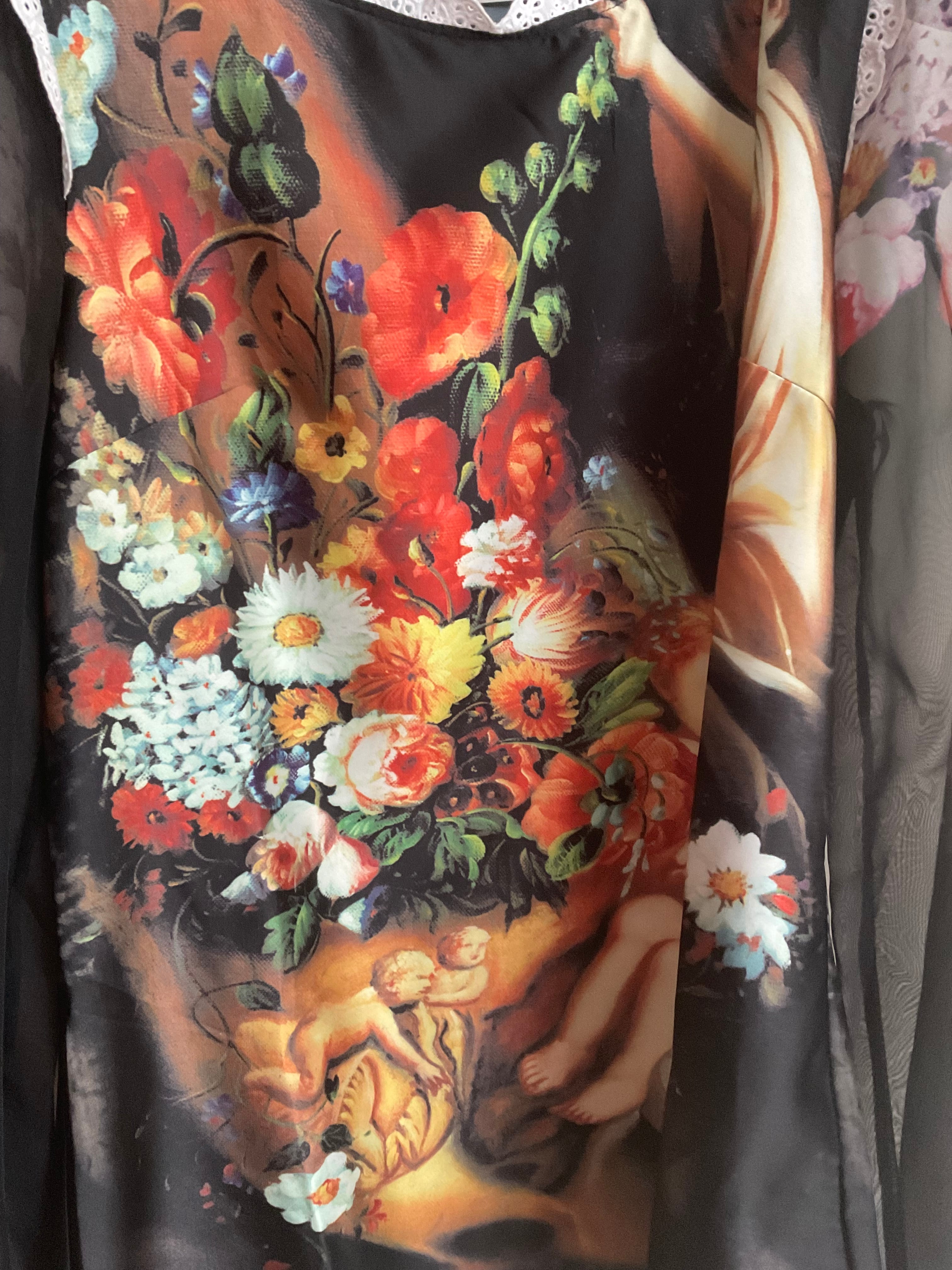 デザイン:黒を基調としたシックなカラーに、華やかな天使と花のプリントが映え、女性らしさを一層引き立てます。レース仕立てのディテールが、大人の魅力を演出し、特別なシーンでもご着用いただけるデザインです。