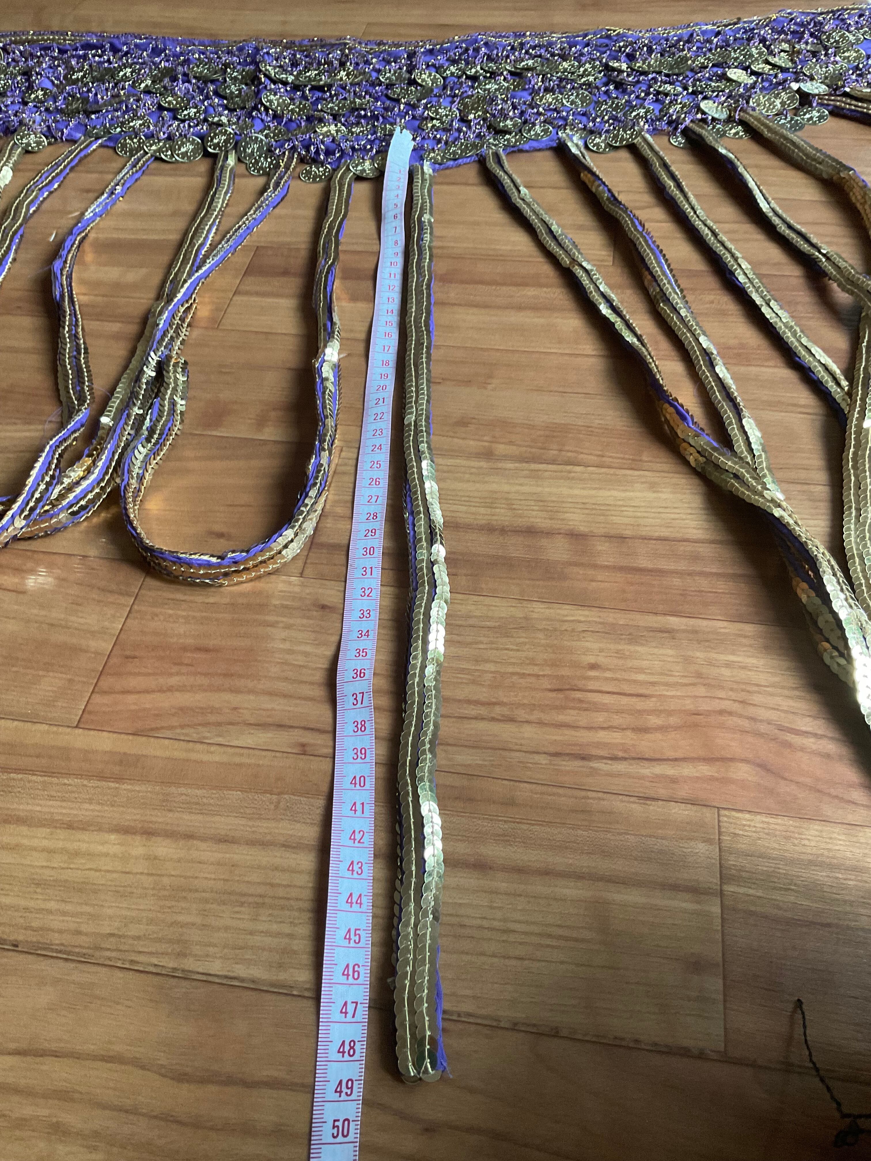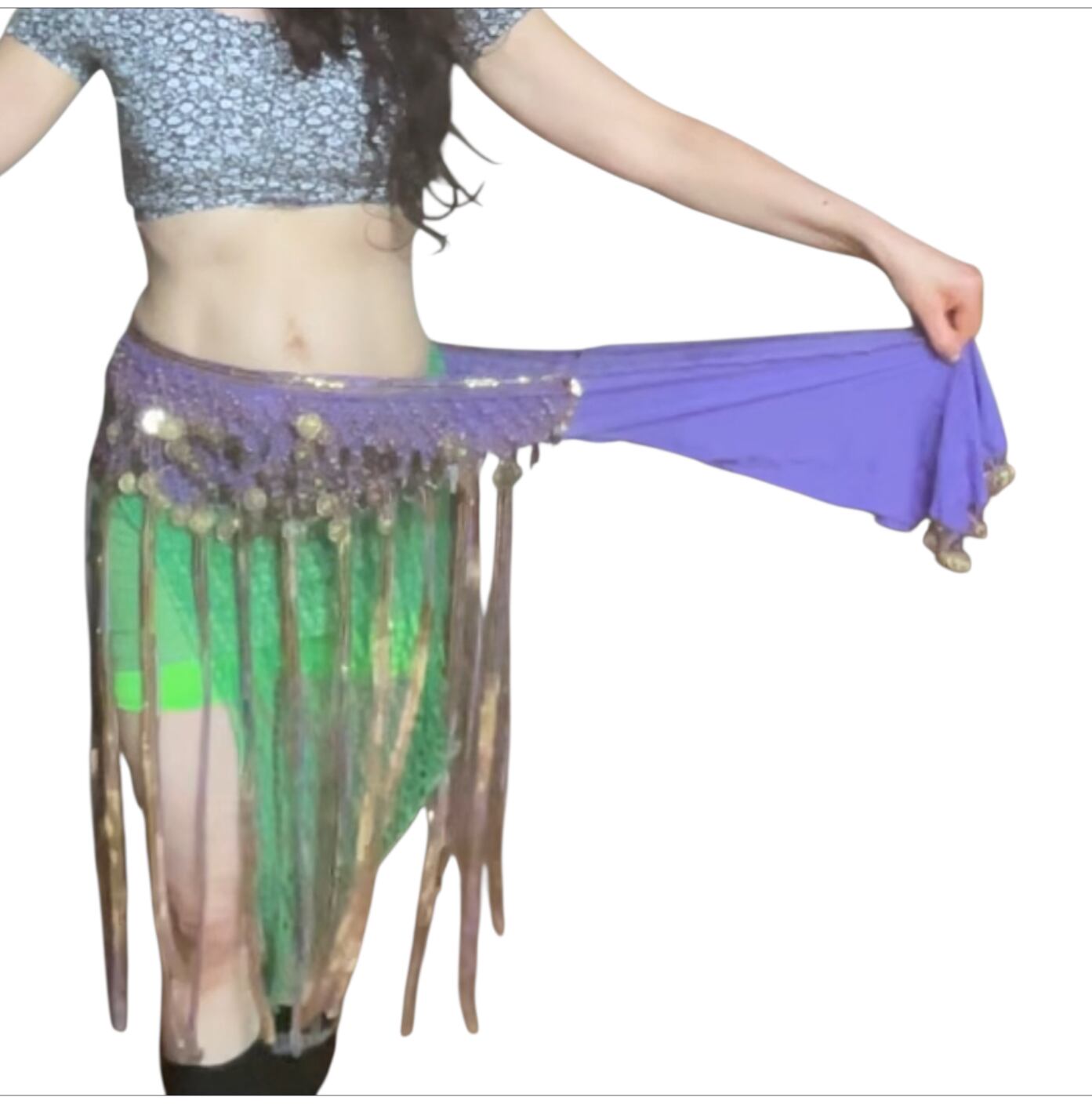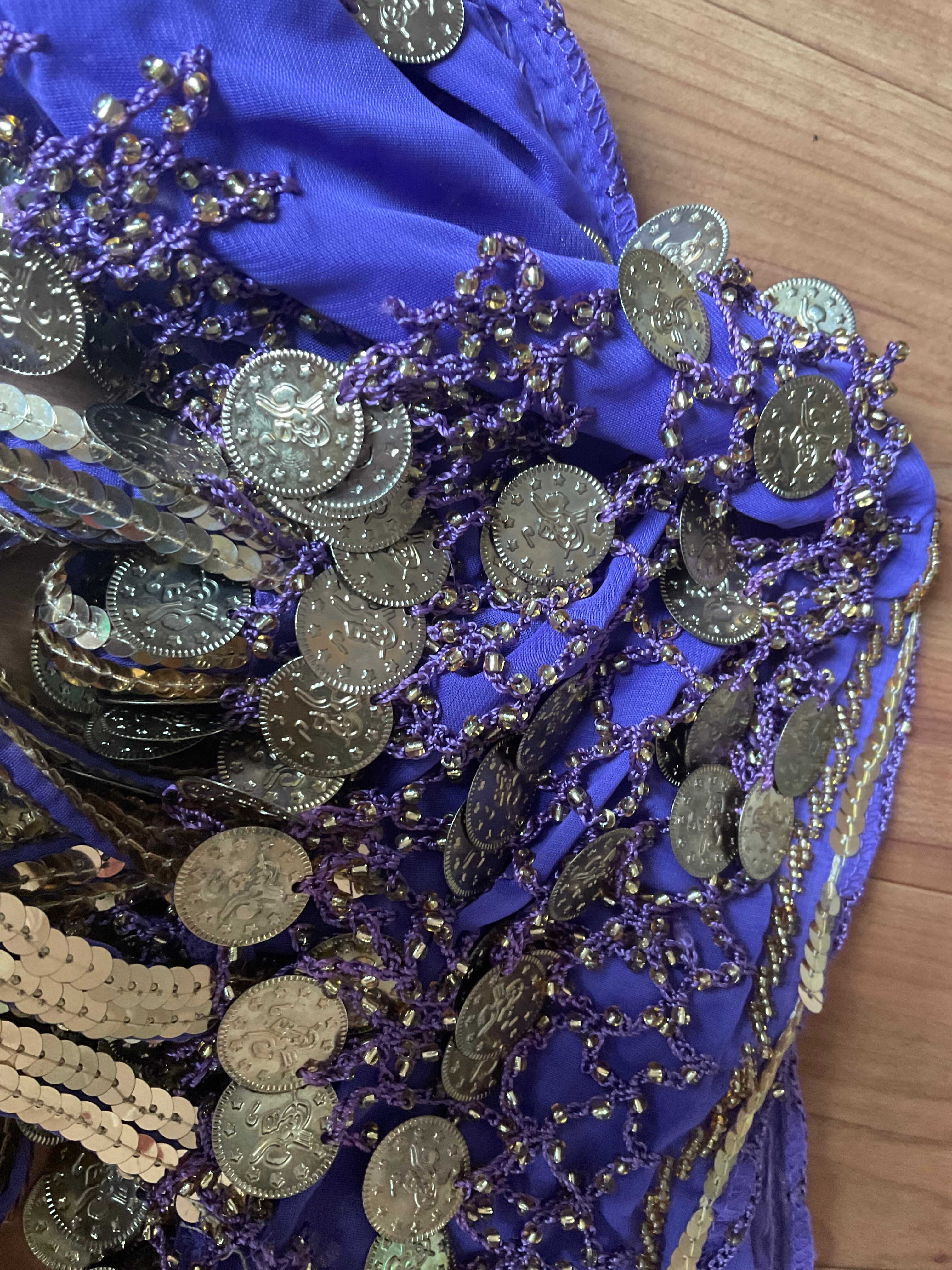 #ベリーダンス #ヒップスカーフ #コインスカーフ #金色コイン #スパンコール #リボン付きスカーフ #ジプシーダンス #フォークロア #民族舞踊 #ステージ衣装 #一点物 #パープルスカーフ #ダンスファッション #発表会衣装