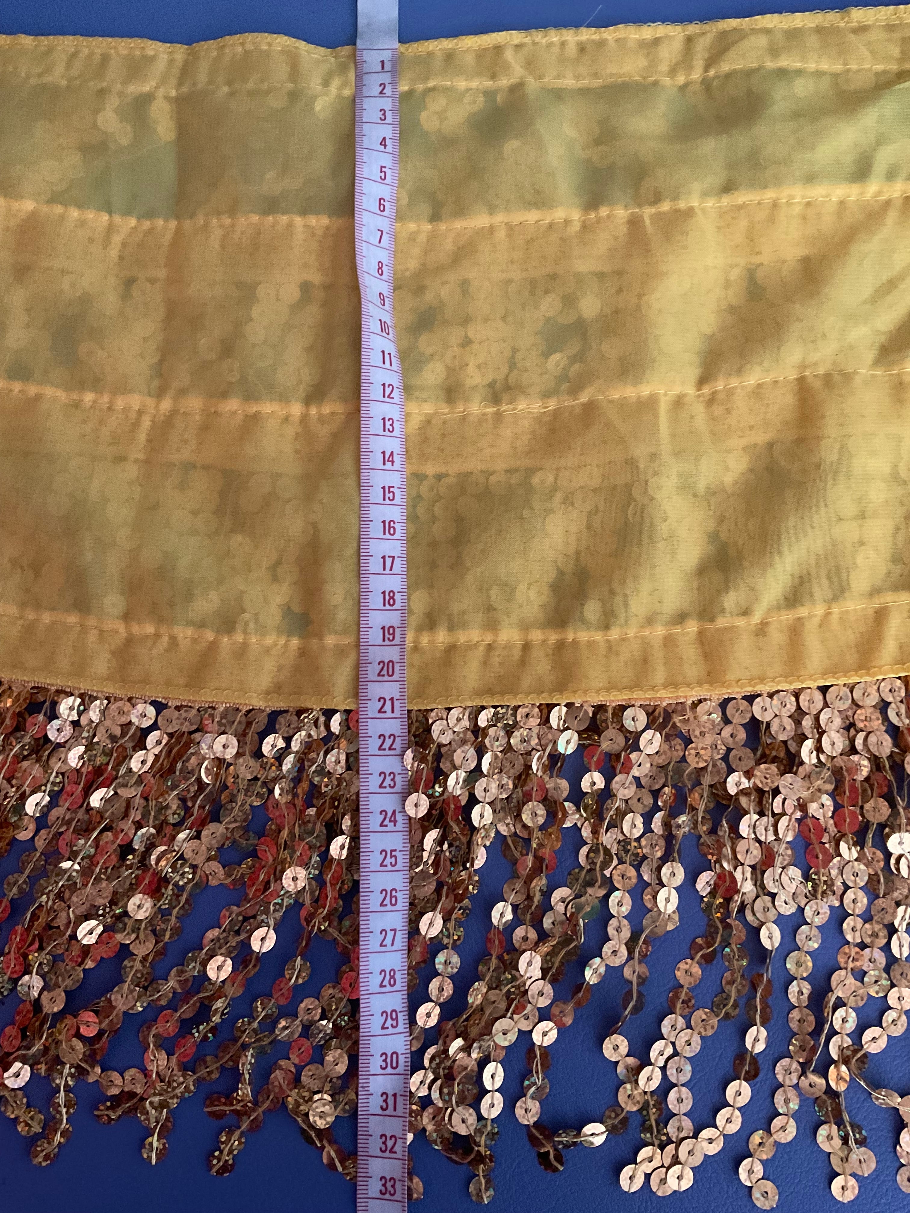 ビビッドなイエローカラーのヒップスカーフは、華やかさとリズム感をプラス。こちらは撮影用・店舗ディスプレイのみの使用で状態良好。目を惹くカラーコントラストが、ベリーダンスやラテン、パーティー、コスプレなど、あらゆる場面で印象的なスタイルを演出します。