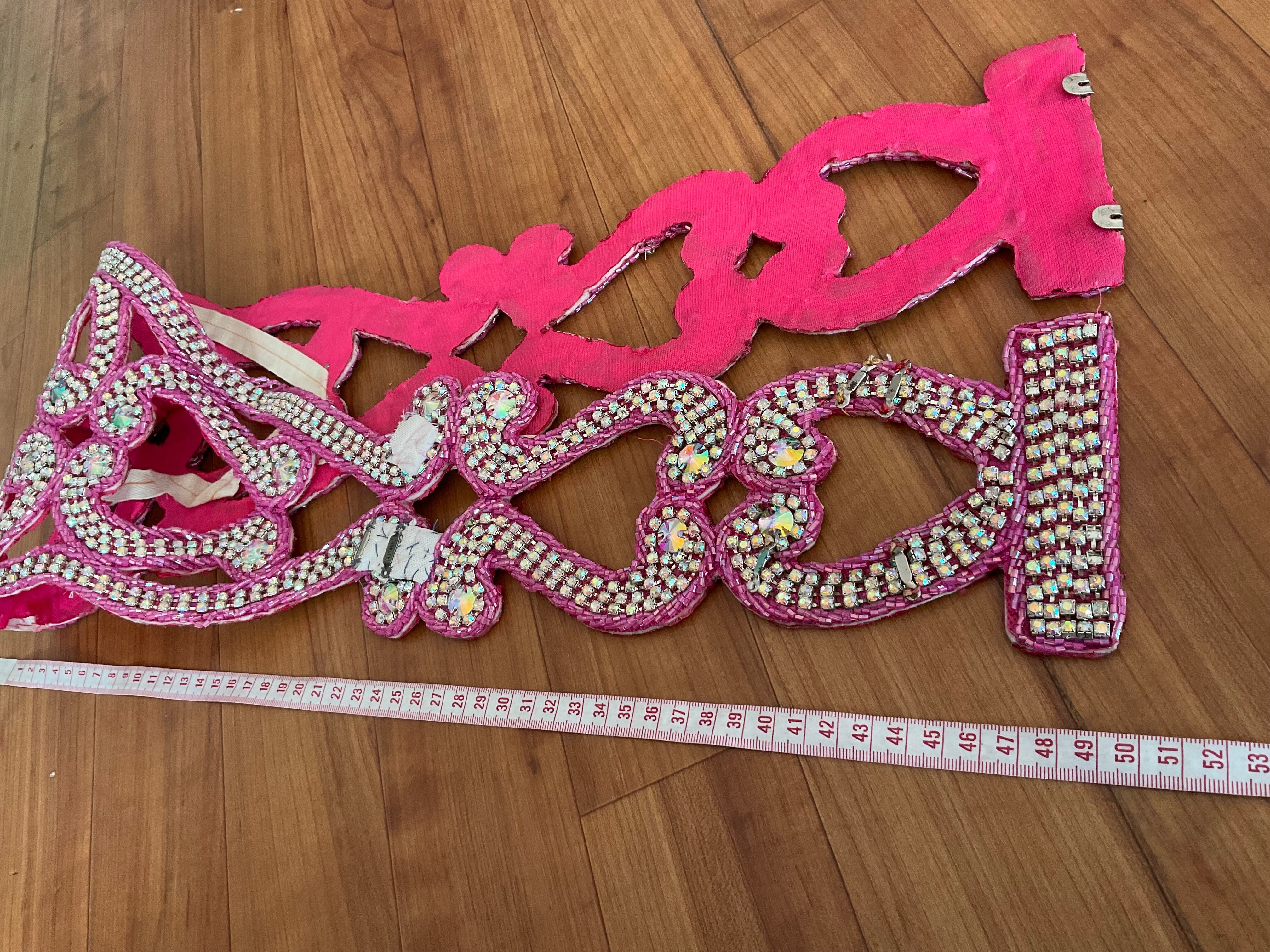 ブラとベルトは、しっかりとした作りで高品質なストーンが全面にあしらわれており、ステージでも美しく輝きます。使用感はありますが、丁寧に作られているため、輝きを失わず、まだまだご使用いただけます。