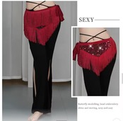 エレガントなワインレッドのフリンジヒップスカーフは、ベリーダンスやラテンダンス、さらにはジプシースタイルのパフォーマンスにも最適な一枚です。全長166cm、タッセル部分は74cm、縦38cmと、しっかりとした存在感のあるデザイン。動きに合わせて揺れる長めのフリンジが、踊りのラインや表現力を美しく引き立ててくれます。
