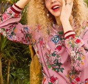 ピンクを基調としたカラフルな花柄に、丸首&ミニ丈、アシンメトリーデザインが映える一着。カジュアルながらも個性と女性らしさを兼ね備えたデザインで、季節を問わず着まわせる万能アイテムです。