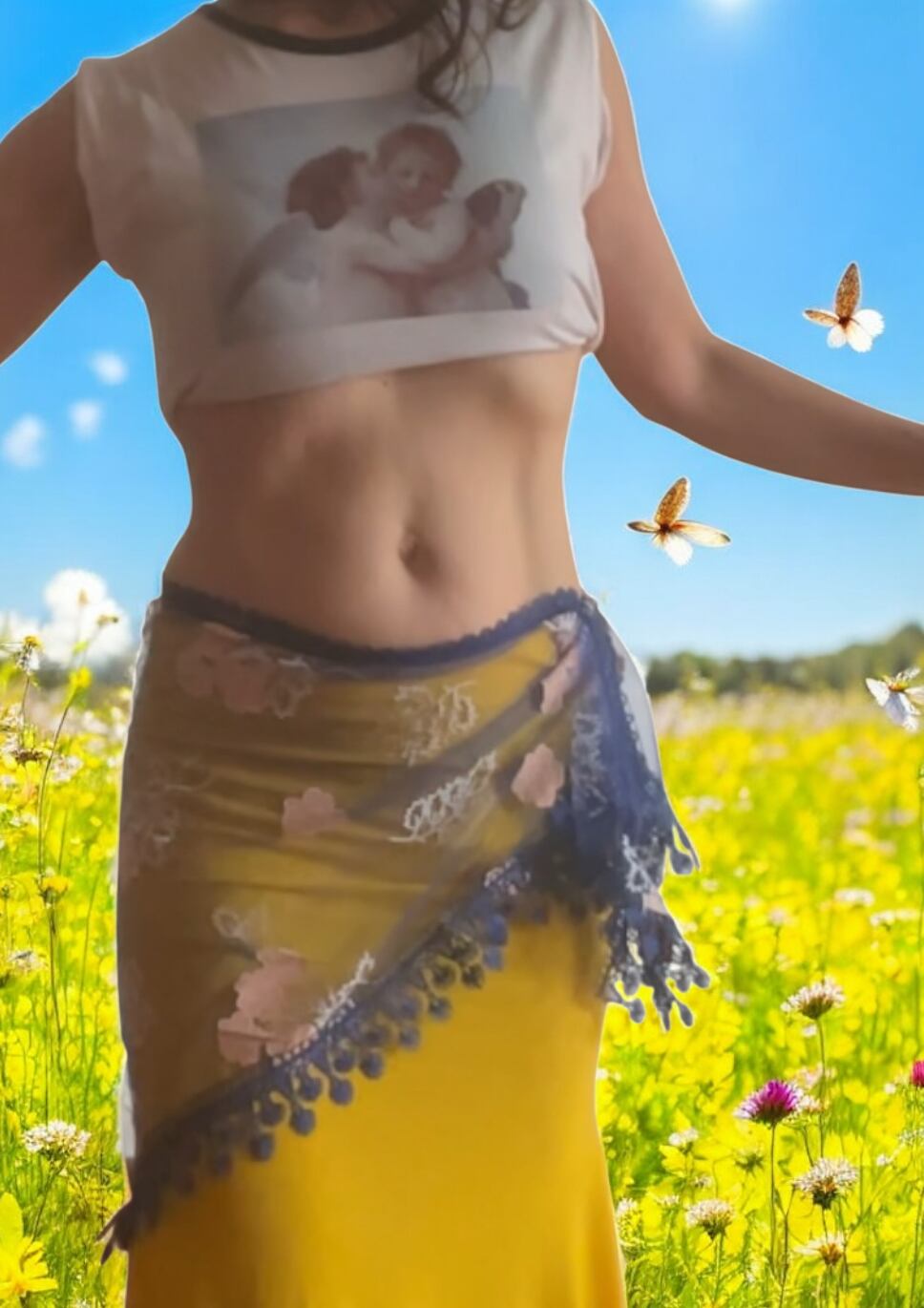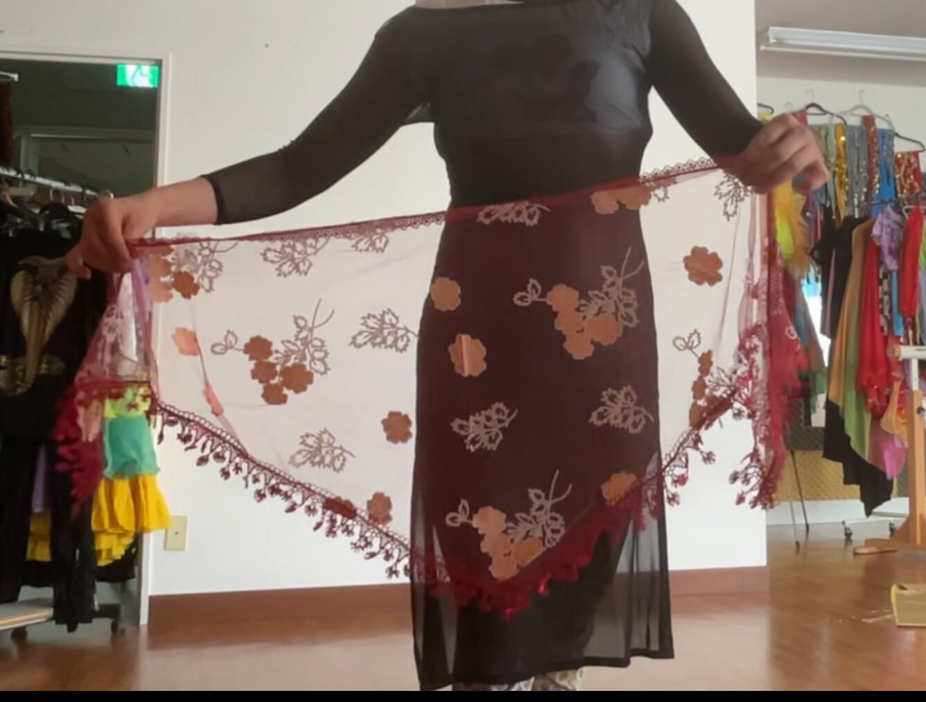 繊細なレースにエレガントな花柄アップリケをあしらった、軽やかで上品なスカーフです。透け感のある柔らかな素材が動きに合わせて美しく揺れ、ベリーダンスやジプシーダンスのステージを一層華やかに演出します。