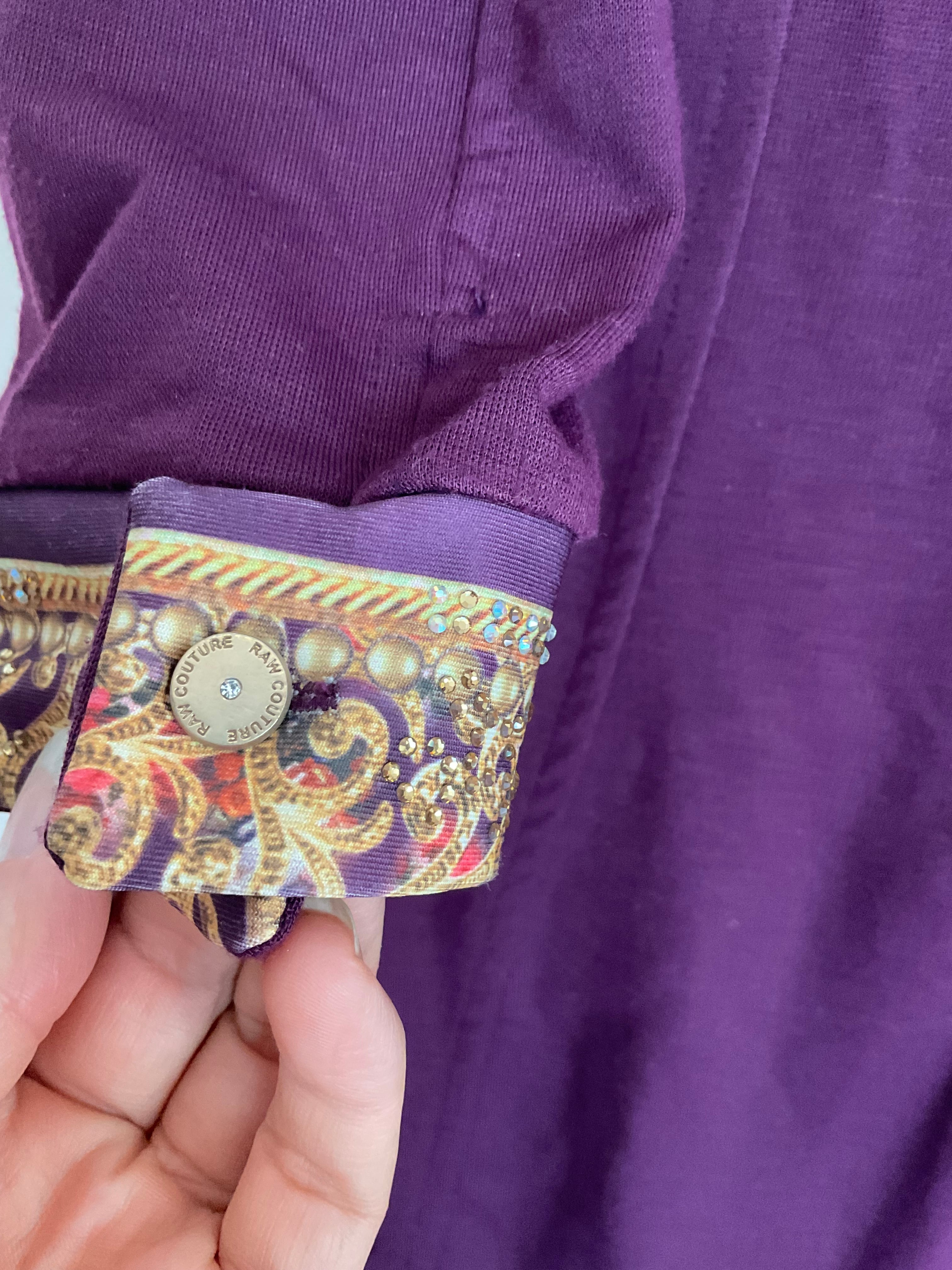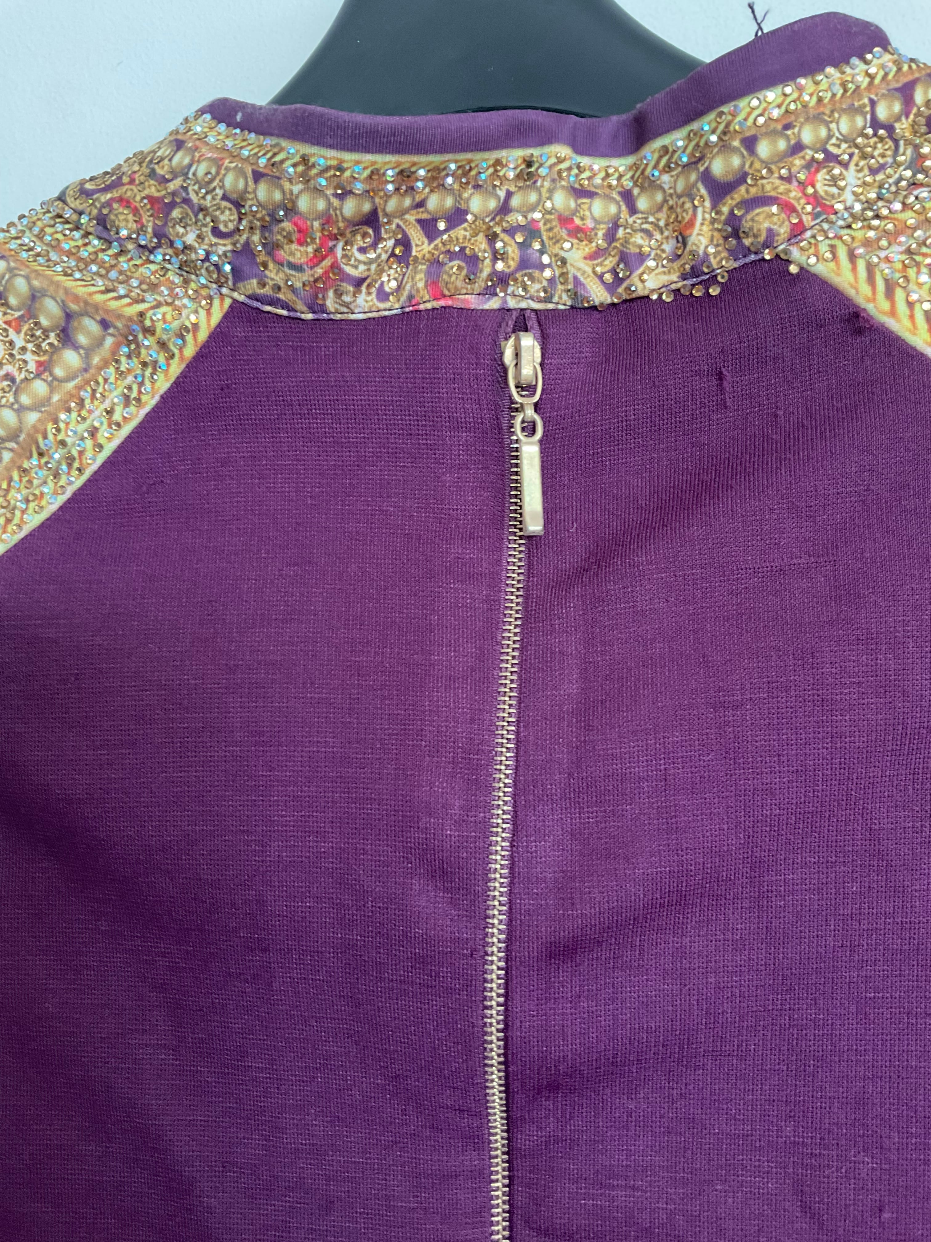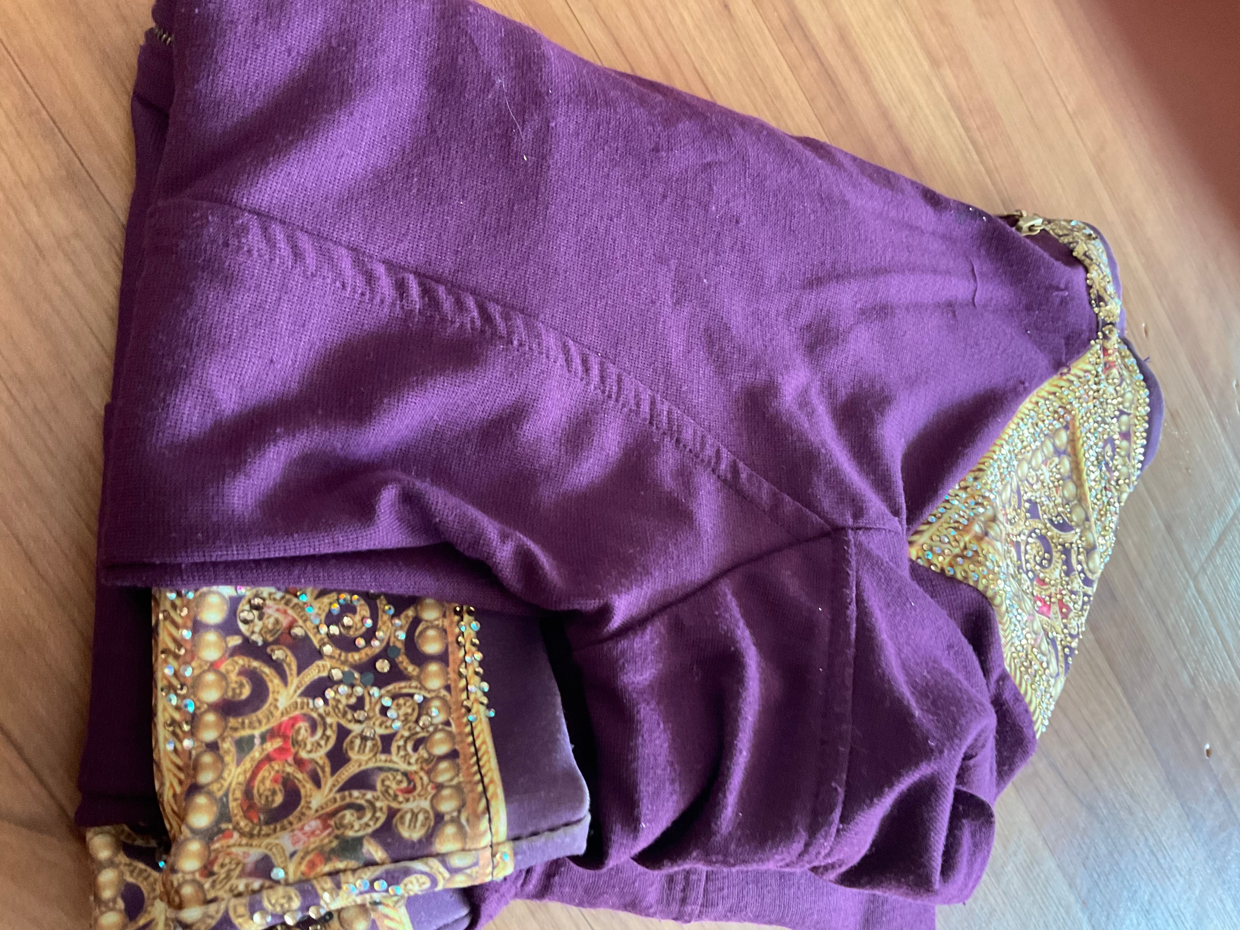 深みのあるパープル生地に金糸刺繍とラインストーンを施し、胸元にも美しい輝きのストーン装飾があります。ベリーダンスやフォークロア系舞台衣装として、またパーティードレスとしても華やかに活躍します。