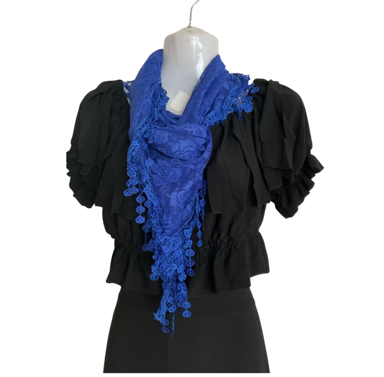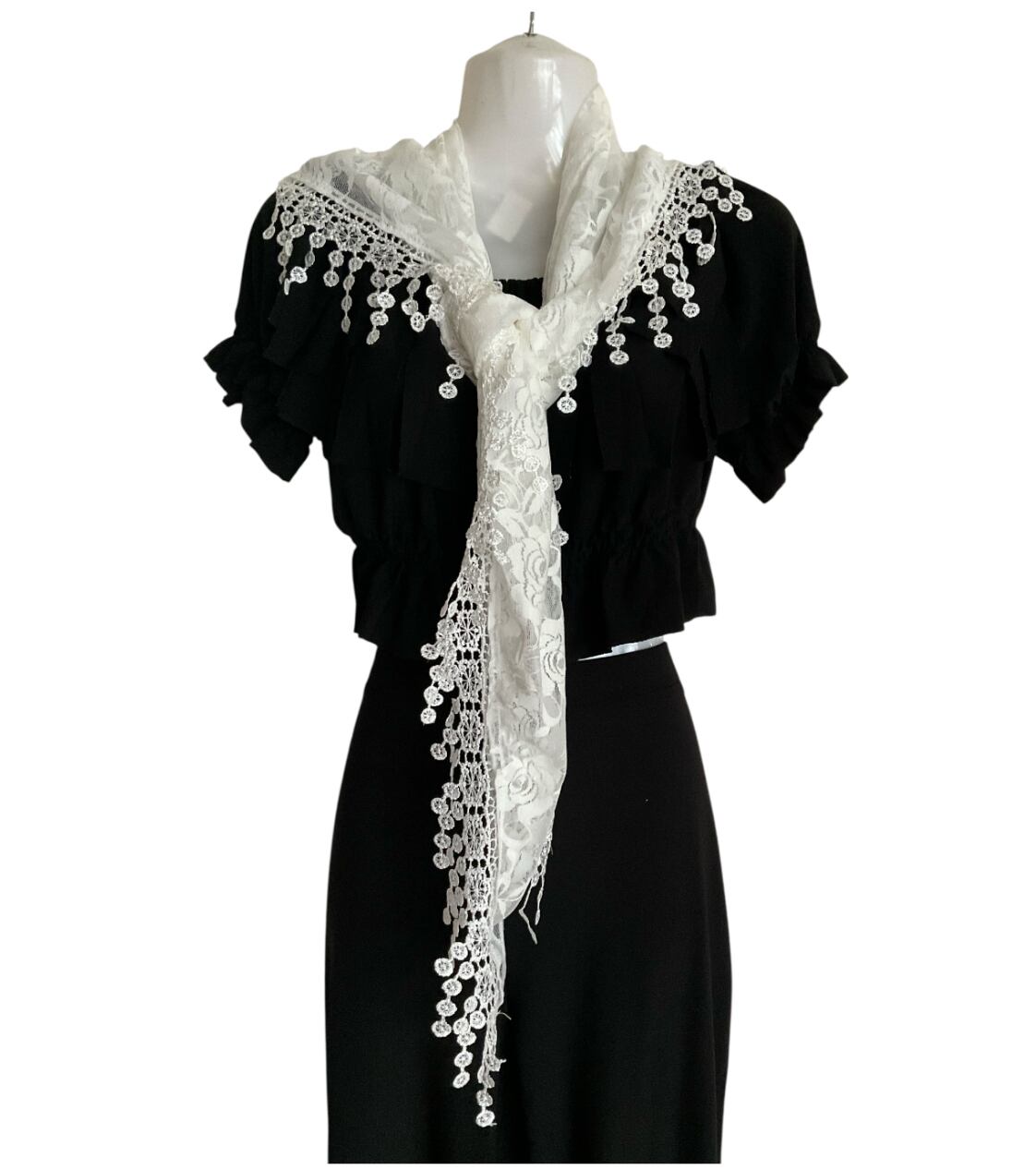 繊細なレースが美しいトライアングルショール。長さ約150cm、最も幅広い部分で約50cmと扱いやすいサイズ感で、ステージでも普段のファッションでも活躍します。