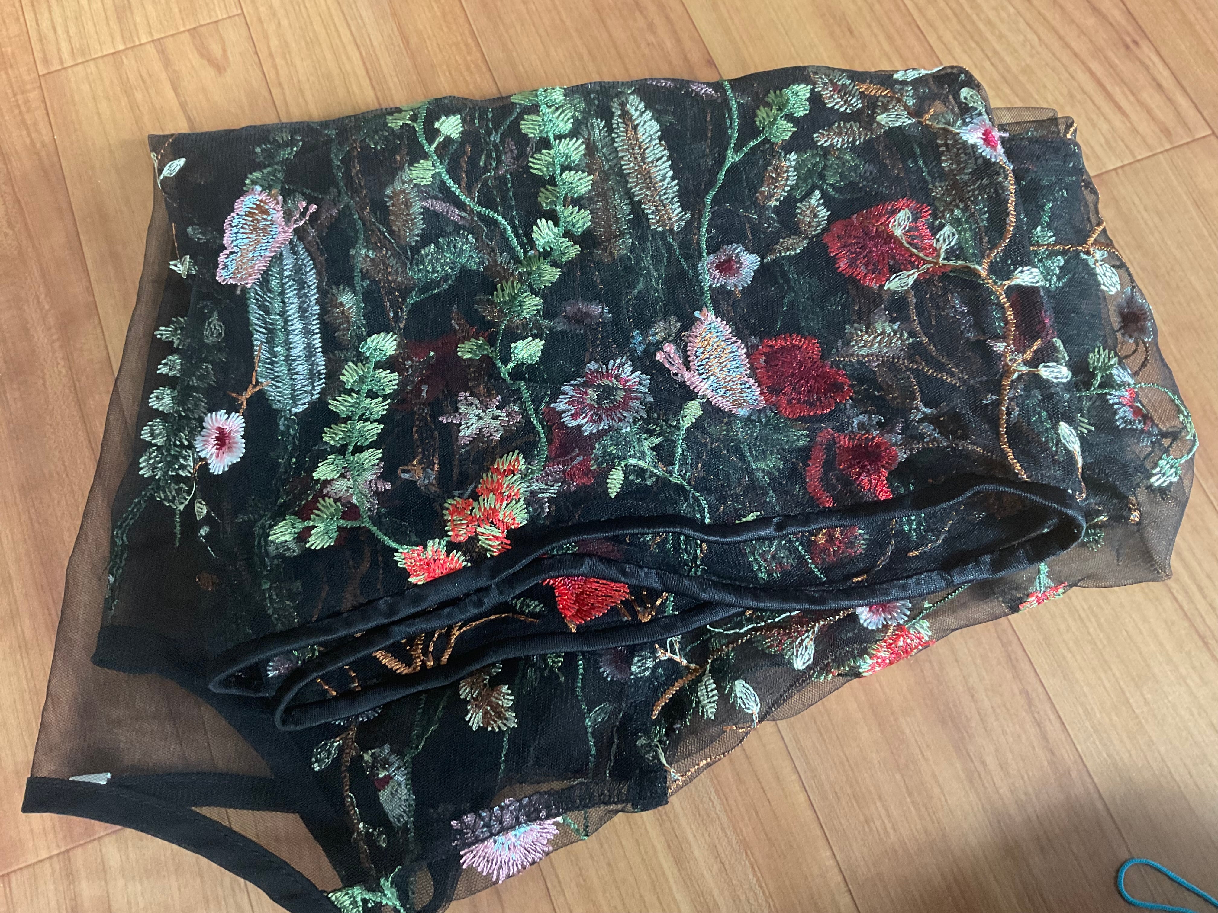 • 華やかな刺繍デザイン:黒のシースルー生地にカラフルな花柄刺繍が全体に施され、ライトの下で美しく映えます。