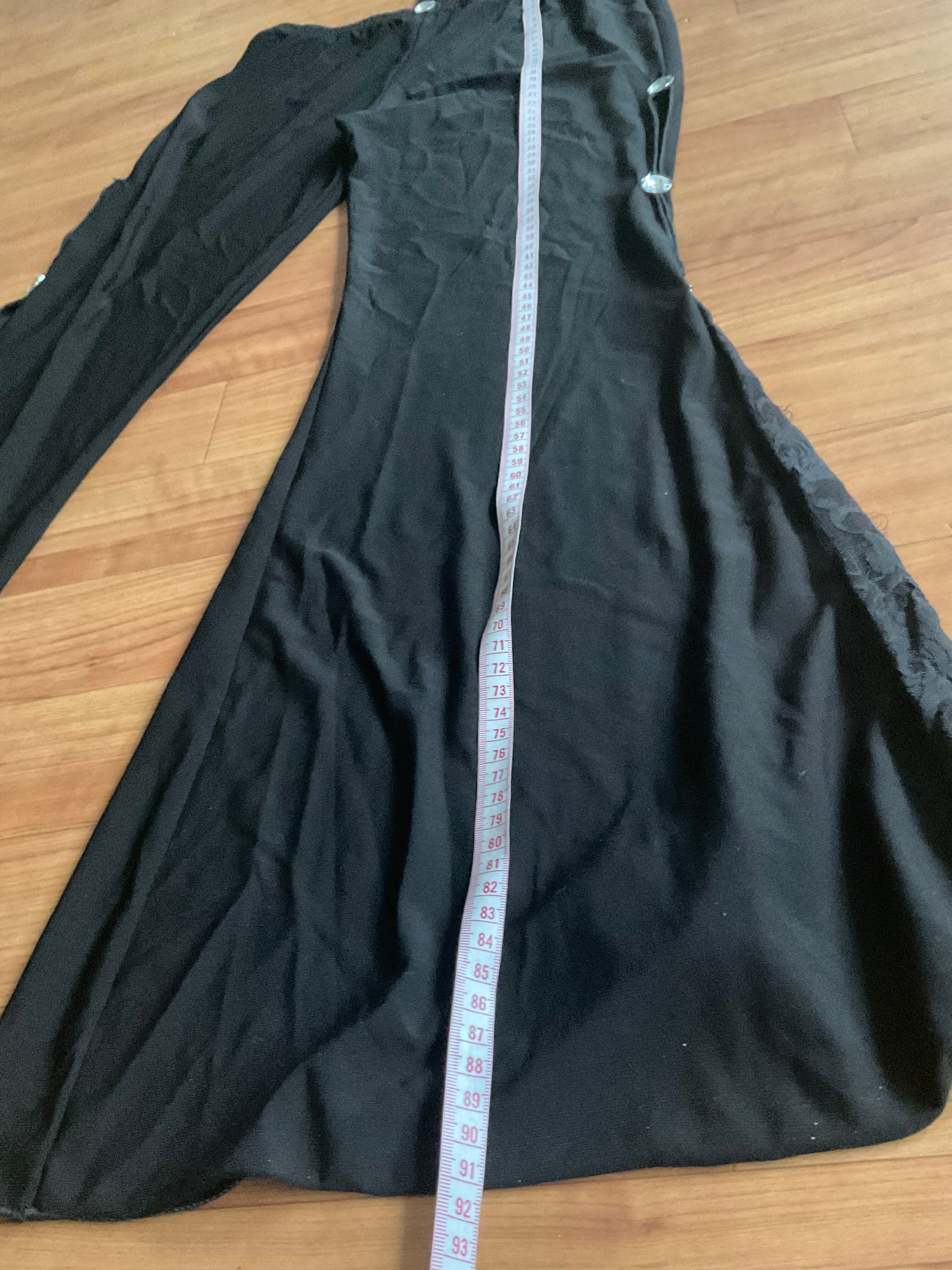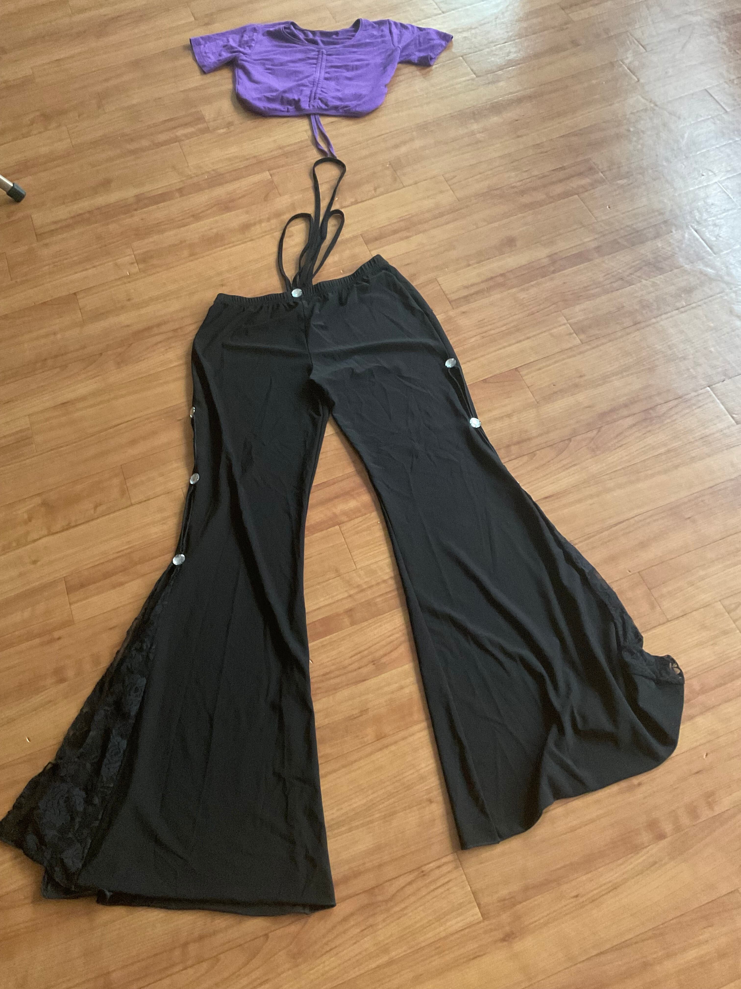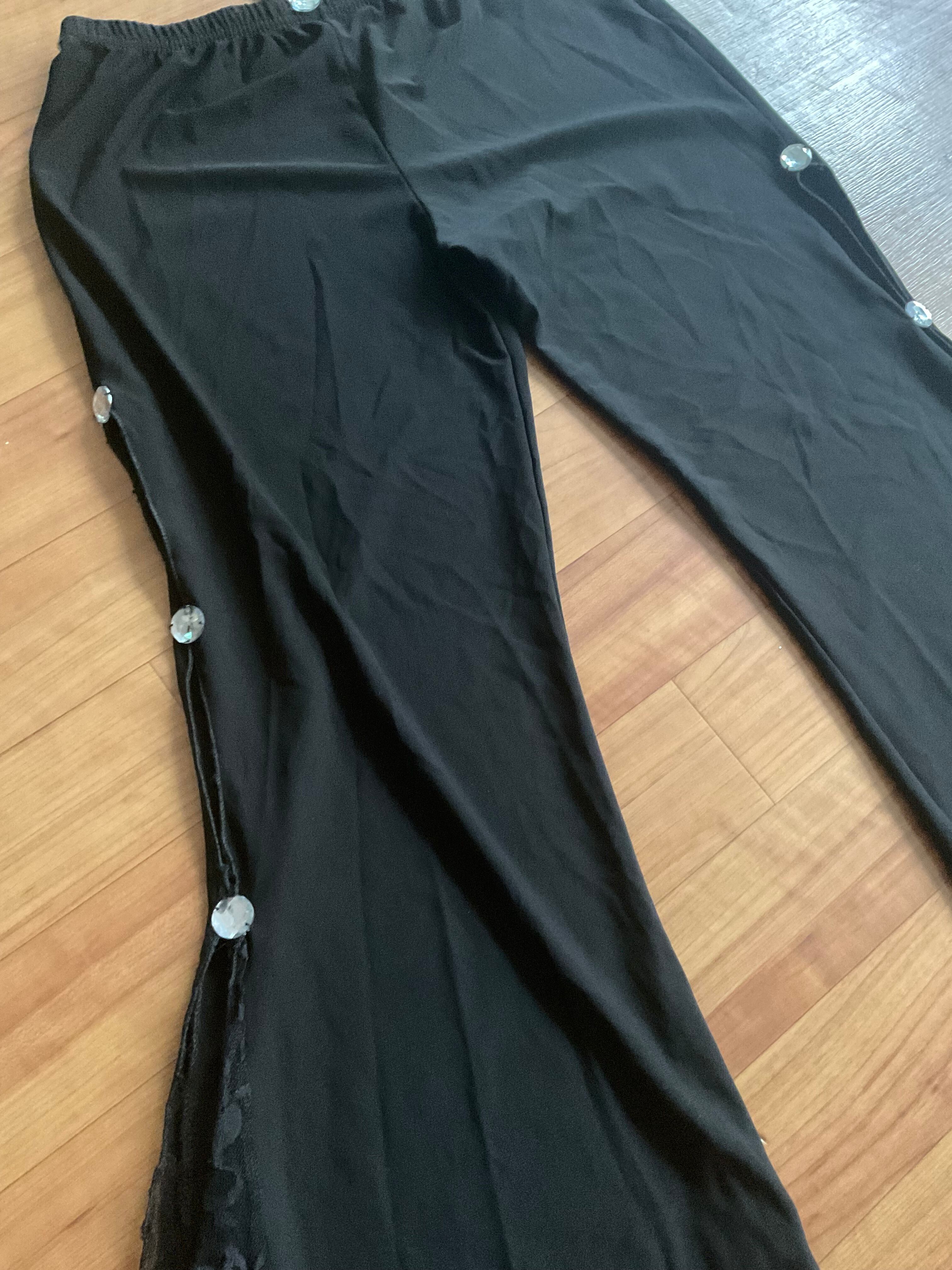 パンツはブラックのフレアタイプで、サイドスリットとアクリルストーンの装飾があります。ウエストはゴム仕様です。