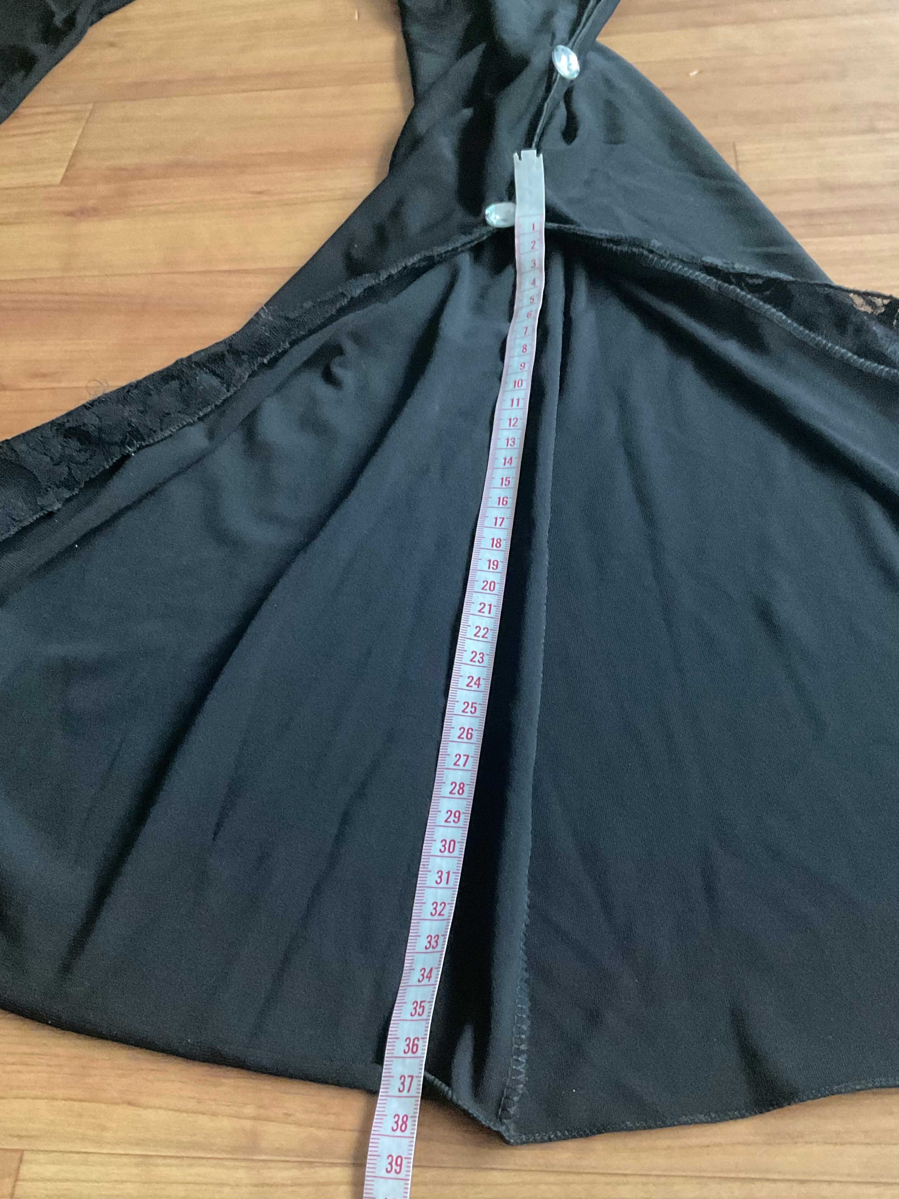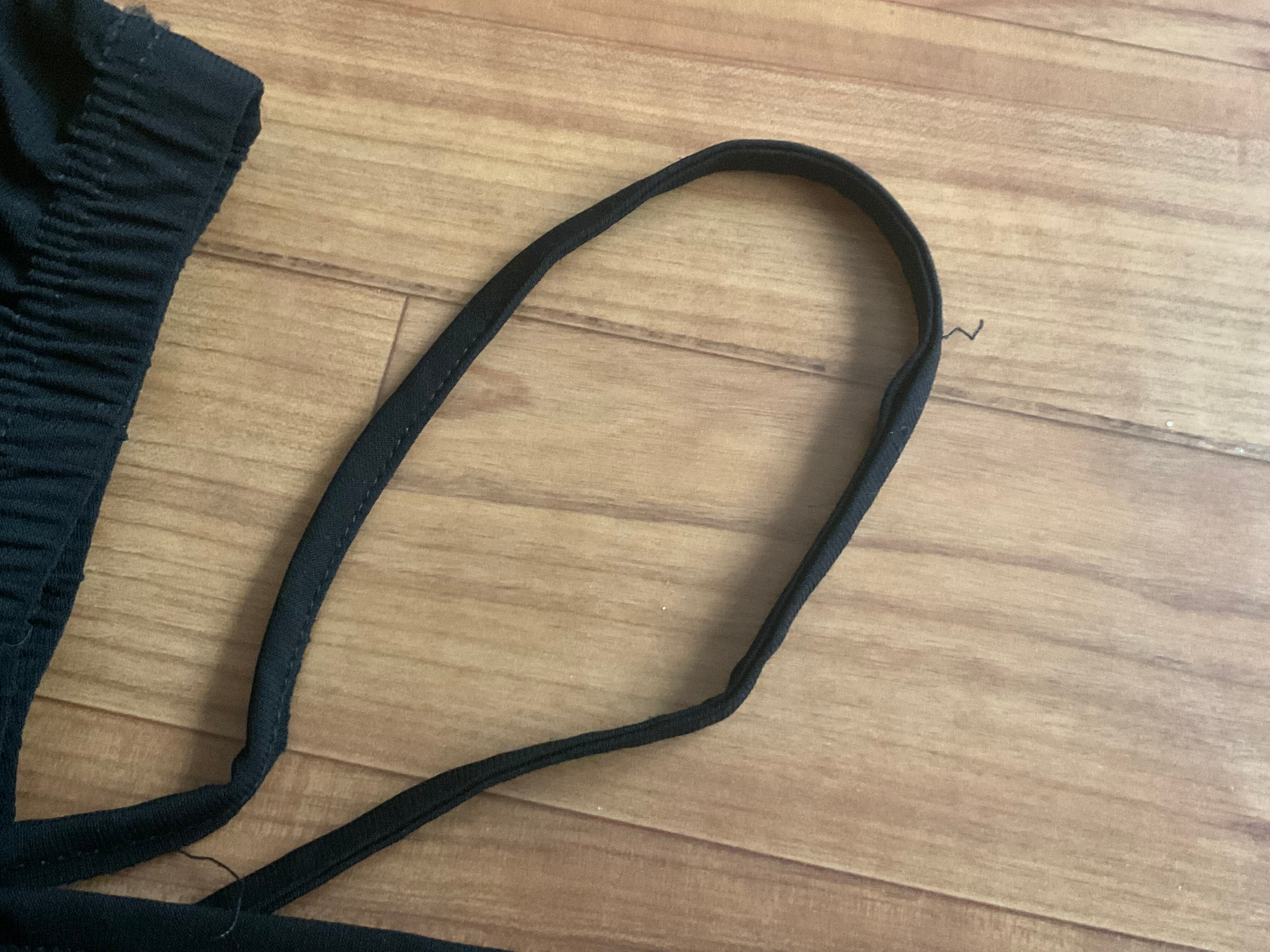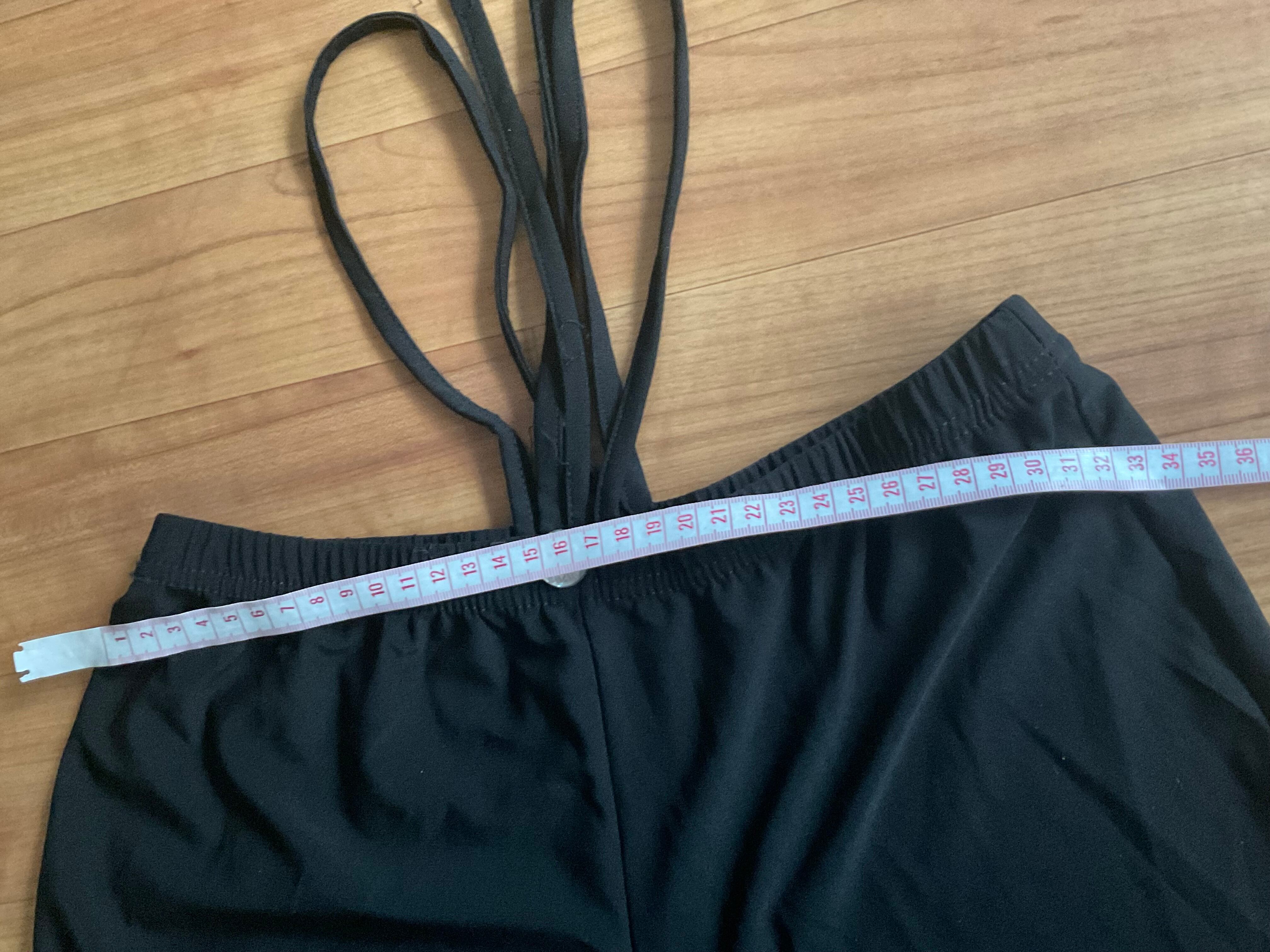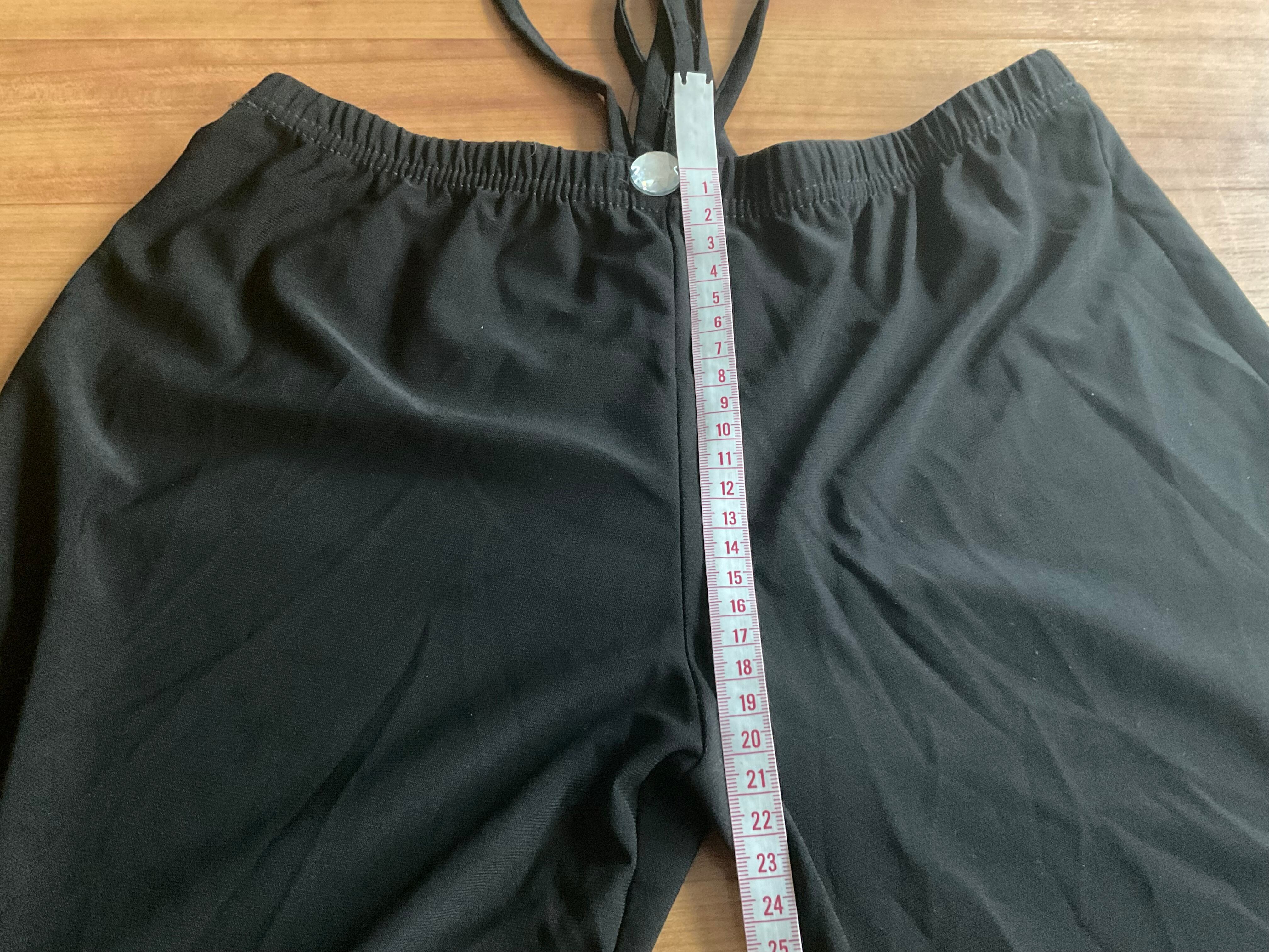 パンツはブラックのフレアタイプで、サイドスリットとアクリルストーンの装飾があります。ウエストはゴム仕様です。