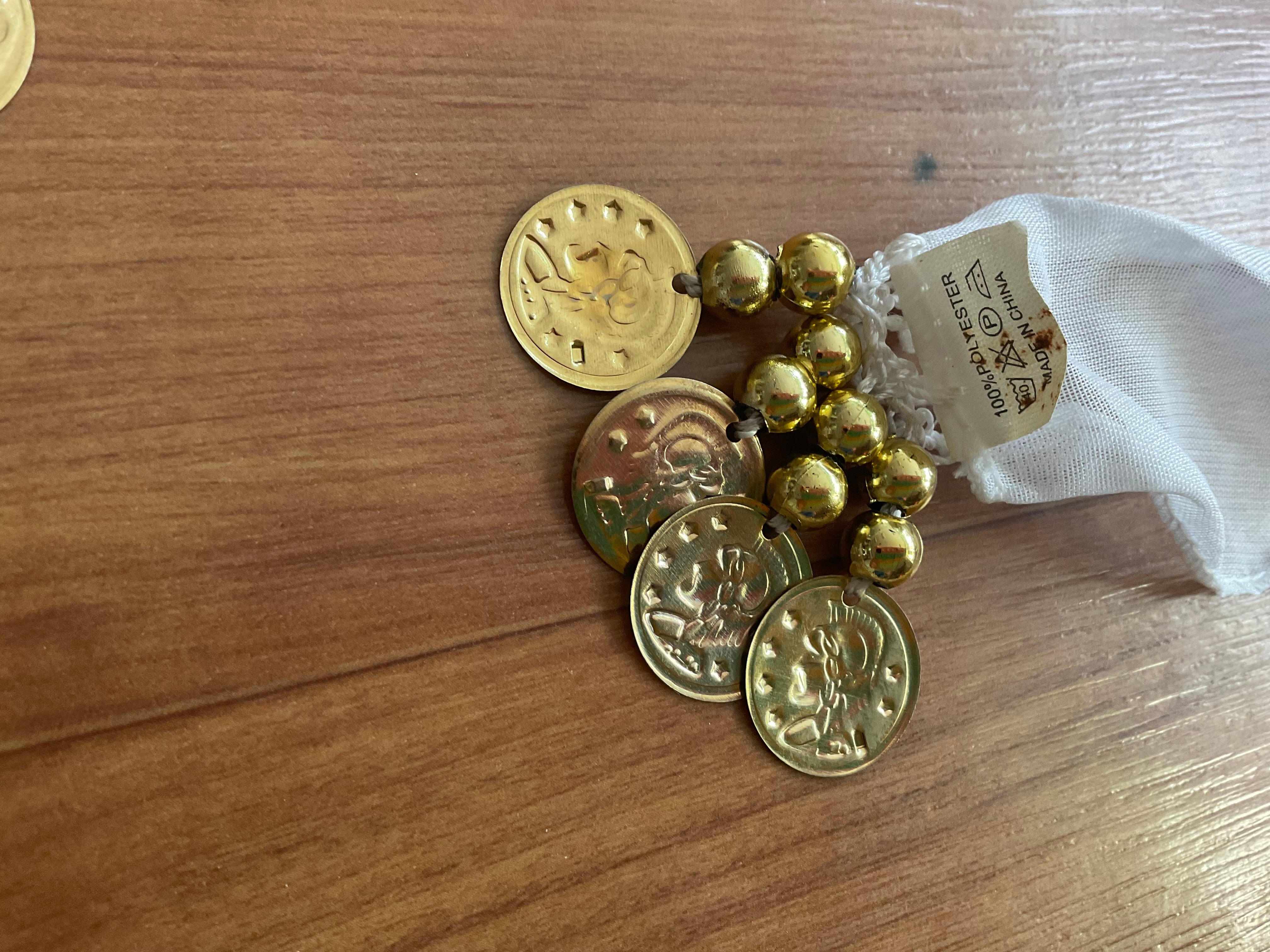 白系のシフォン生地にゴールドカラーのコイン装飾が施され、動きに合わせて上品で心地よい音を奏でます。