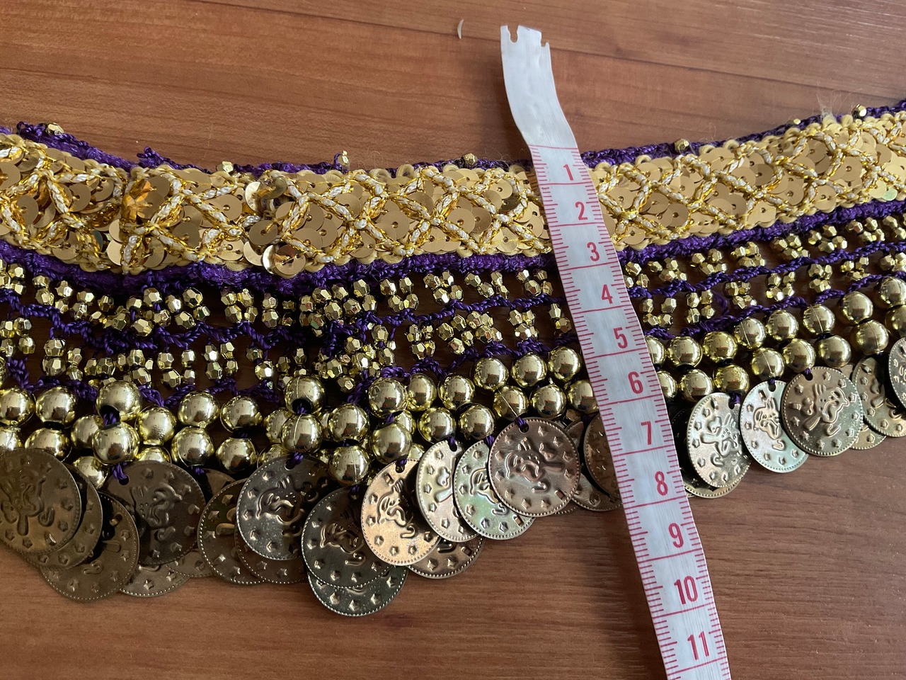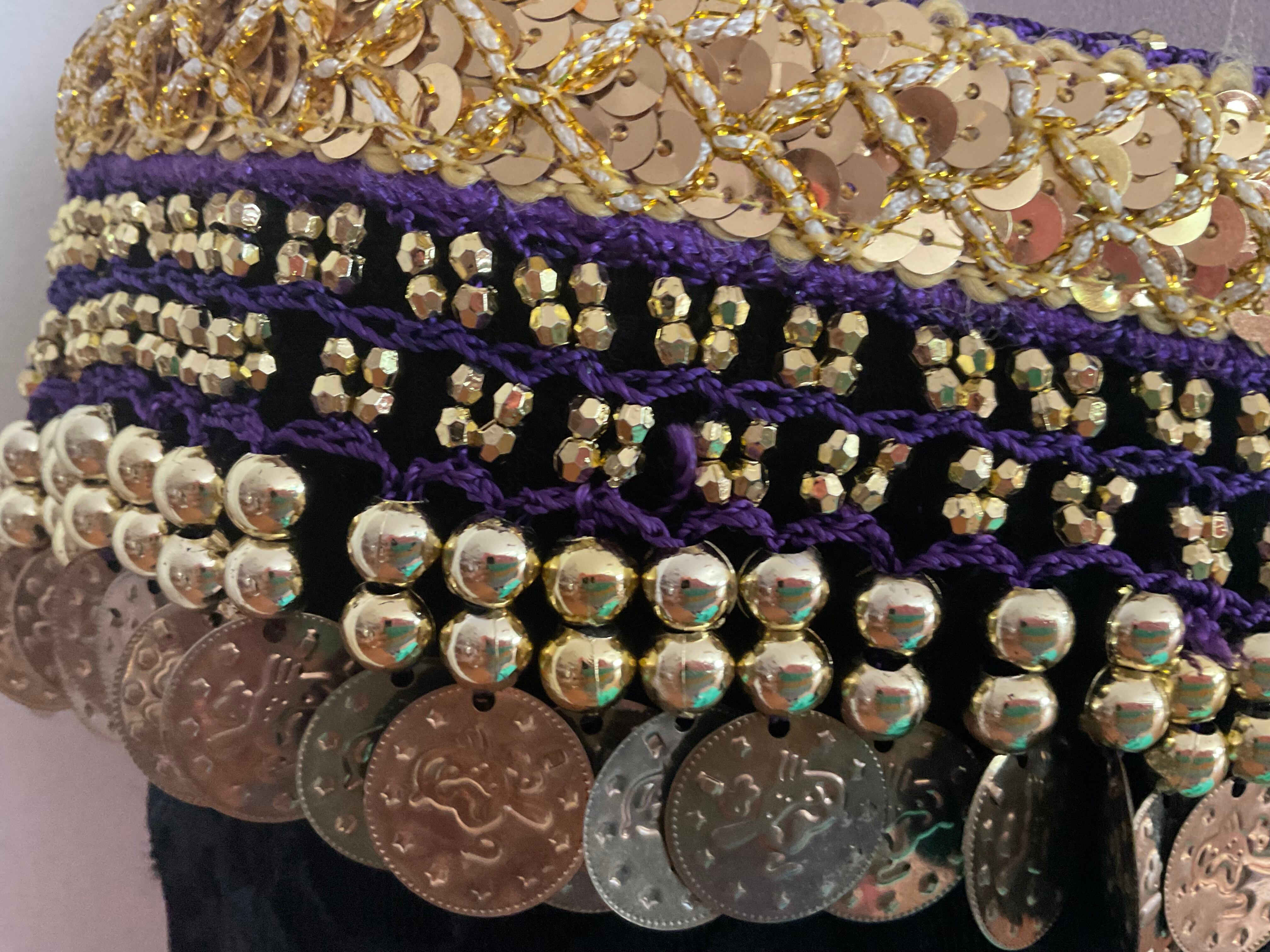 ベルベット調の柔らかい生地に、ゴールドのコインとビーズが豪華にあしらわれており、動きに合わせて軽やかな音が鳴ります。