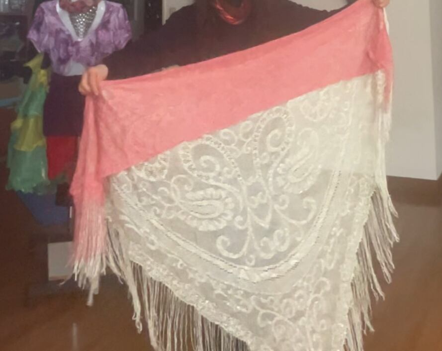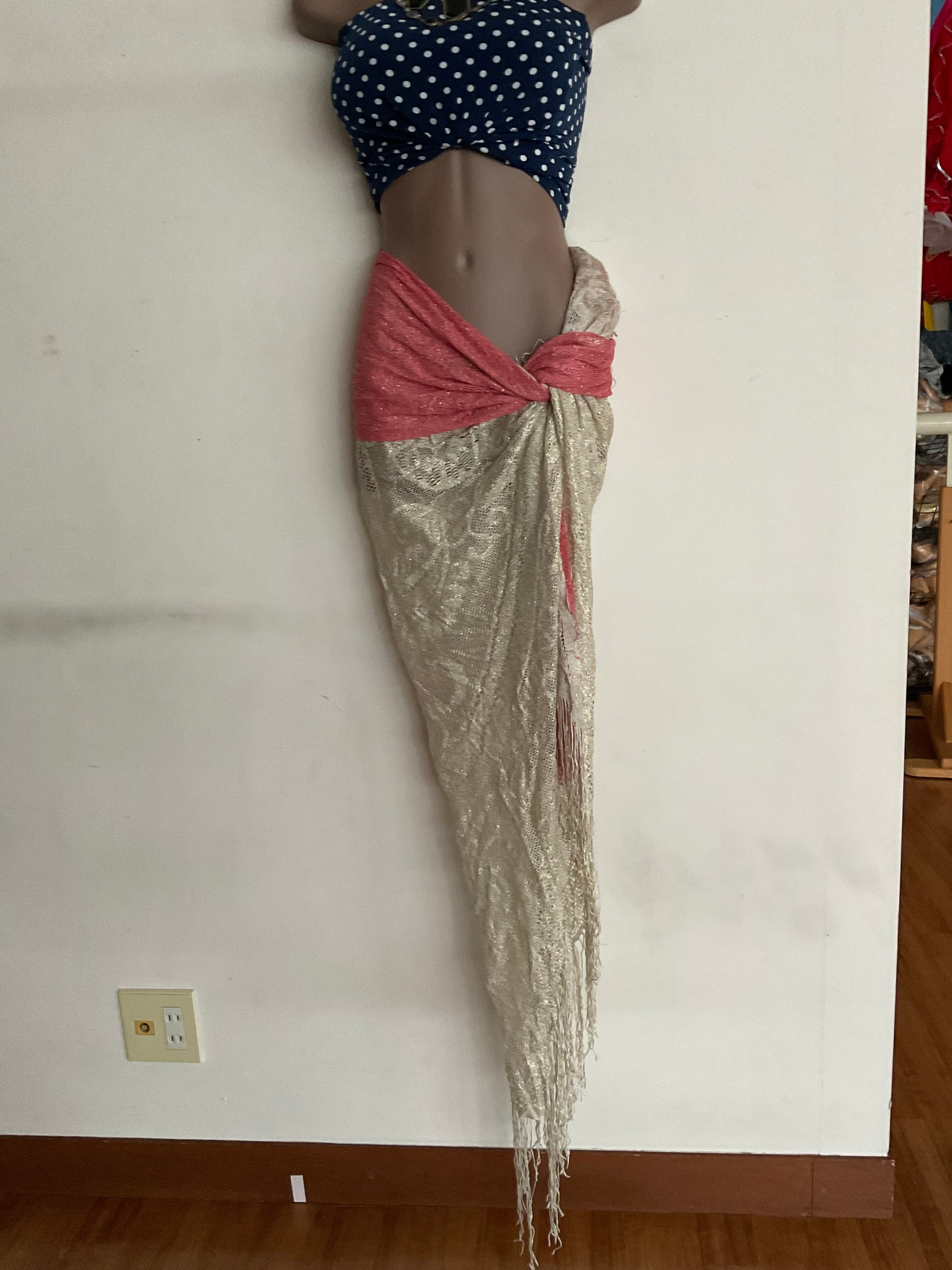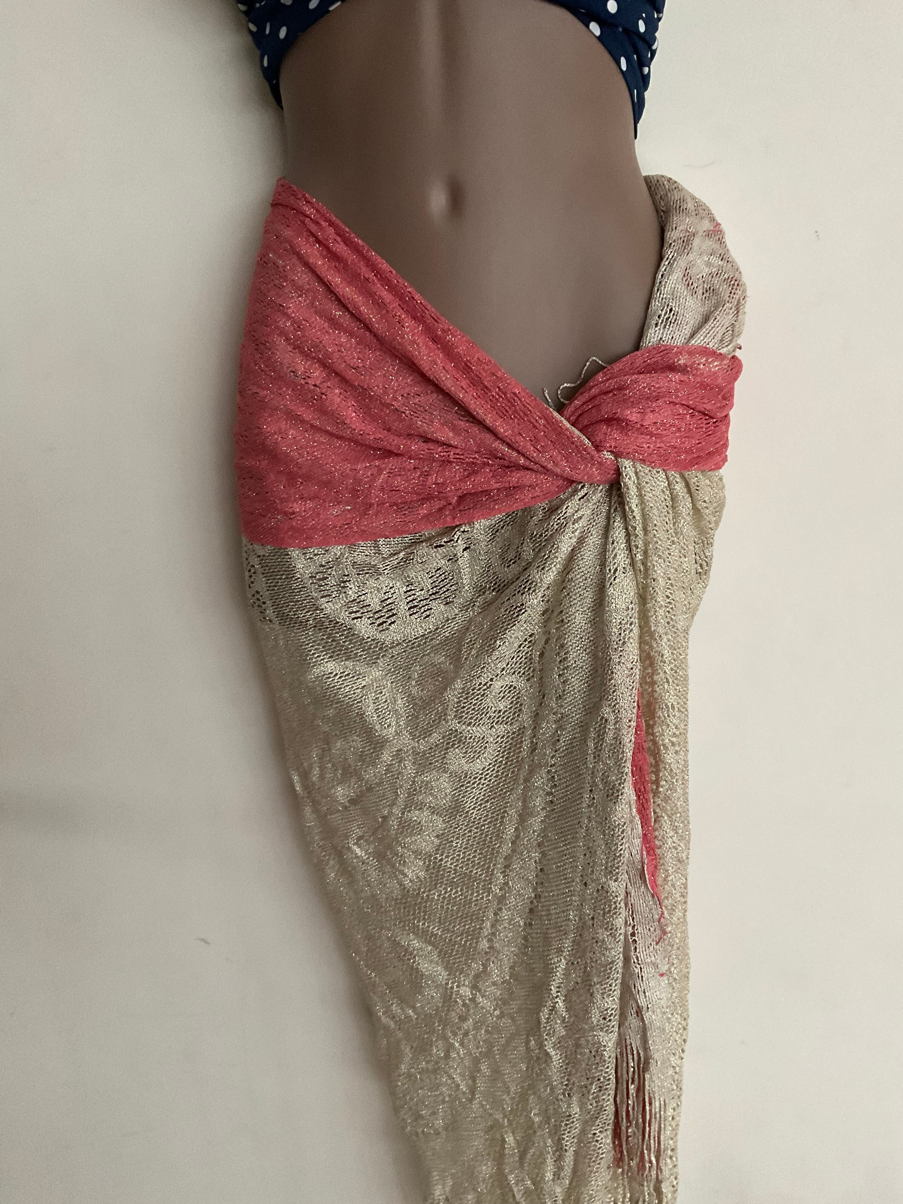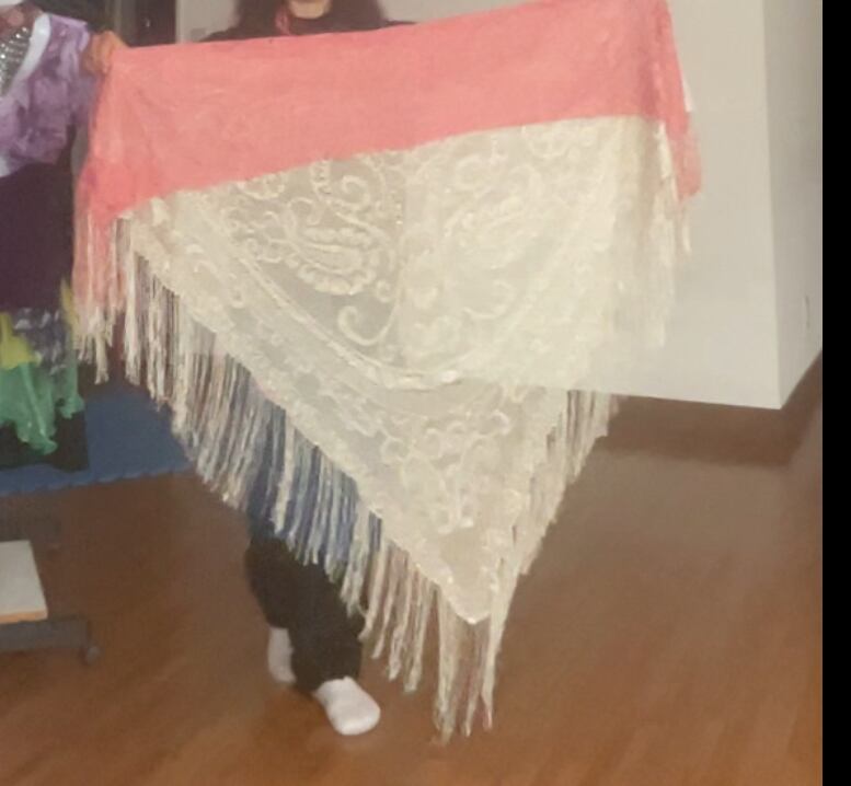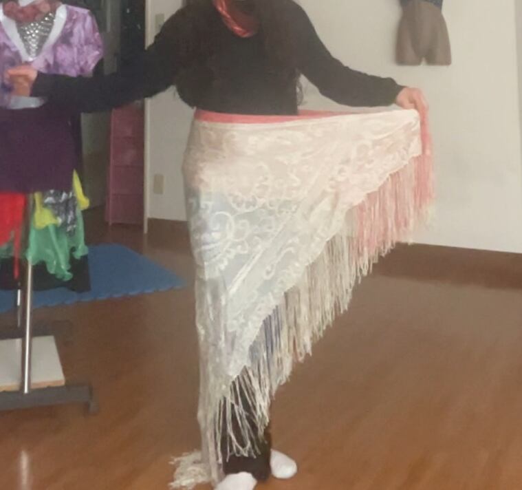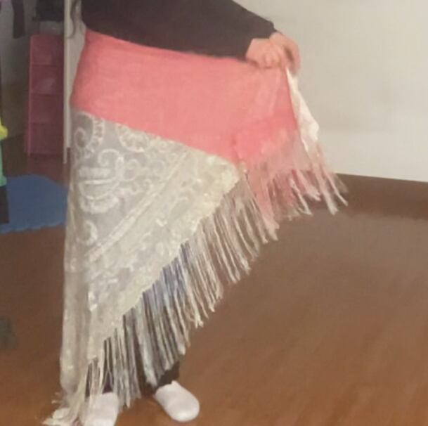 もともと別々のレースショール2枚を縫い合わせ、1枚のショールとして使用していたものです。腰に巻いてヒップスカーフとして、また肩に羽織るショールとしても使いやすく、ステージで動きがきれいに出ます。