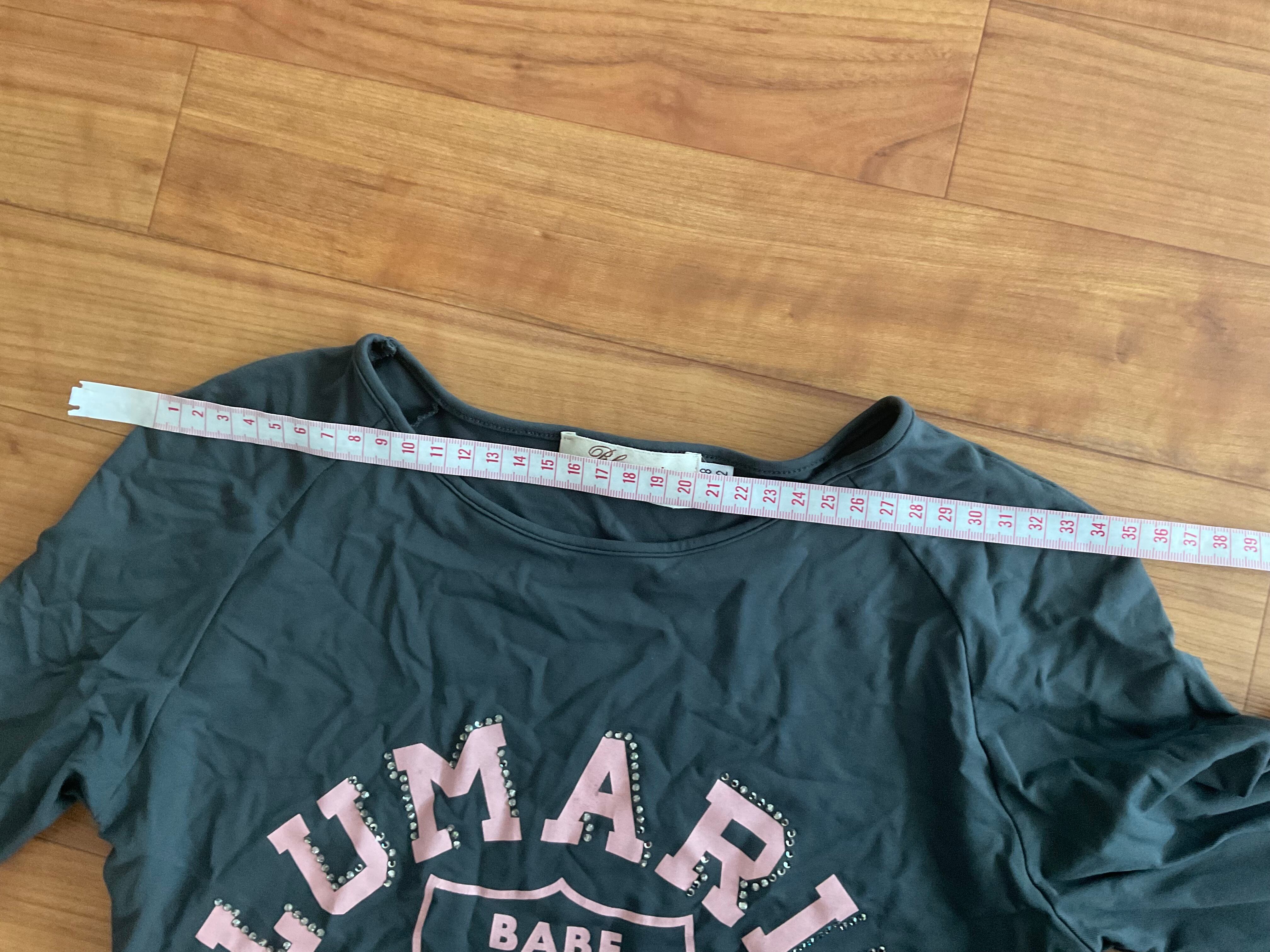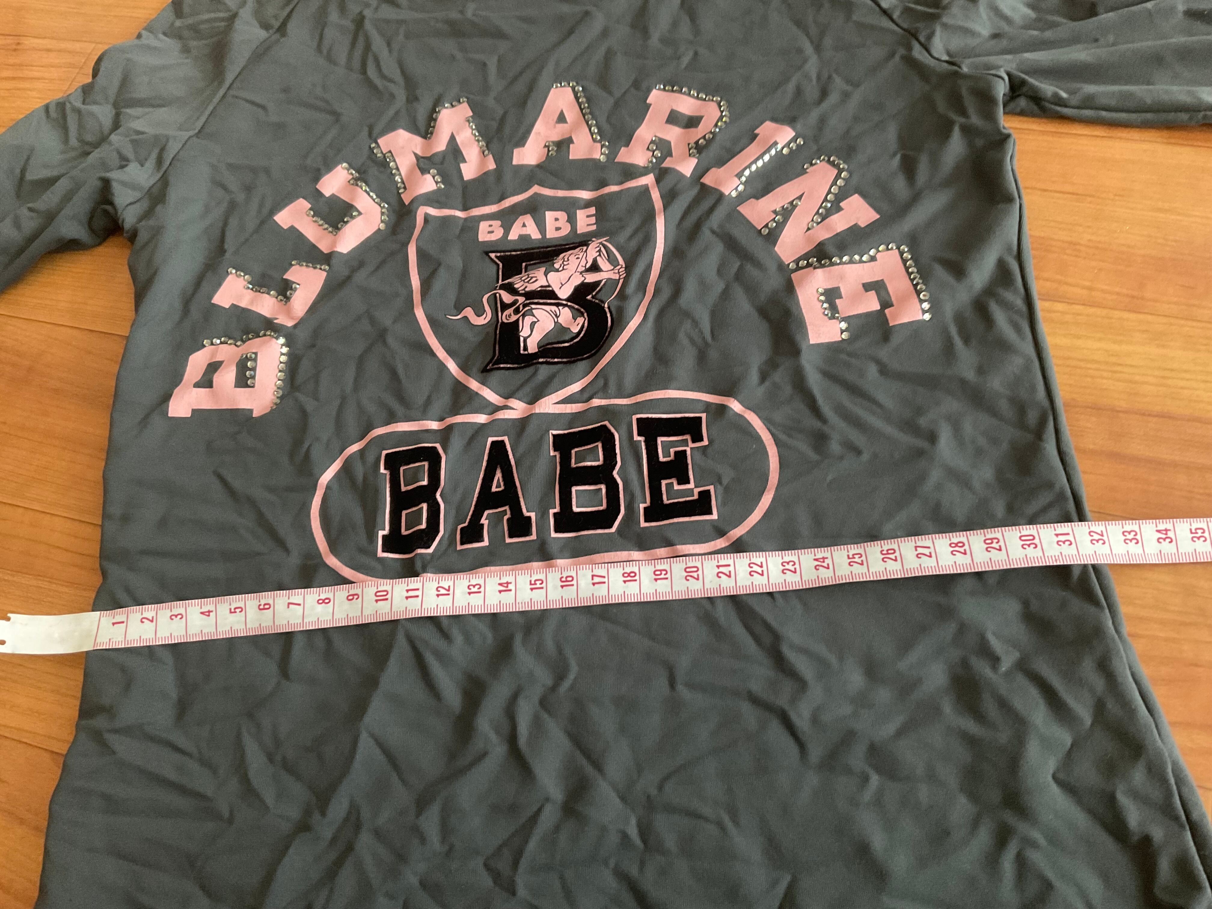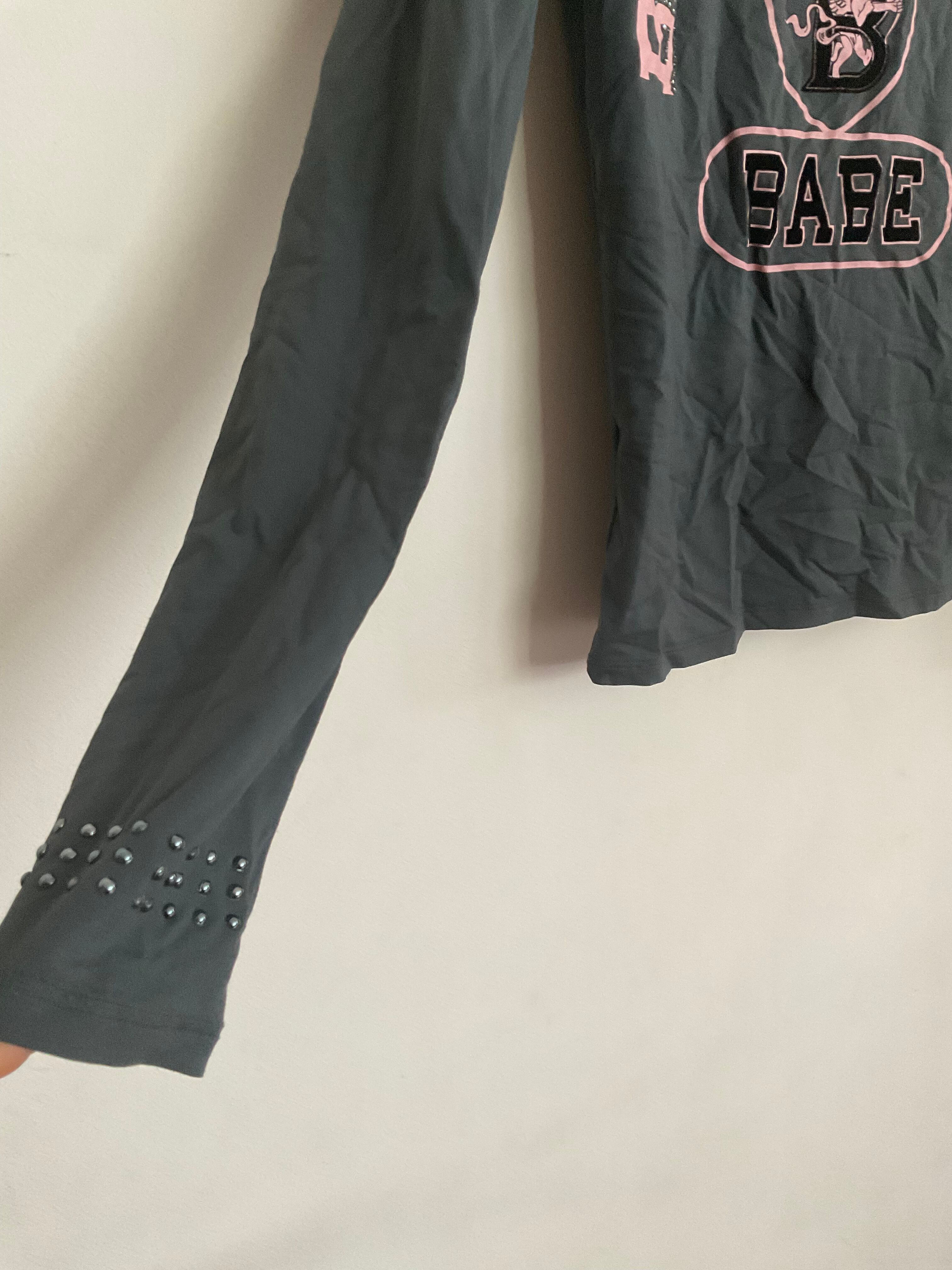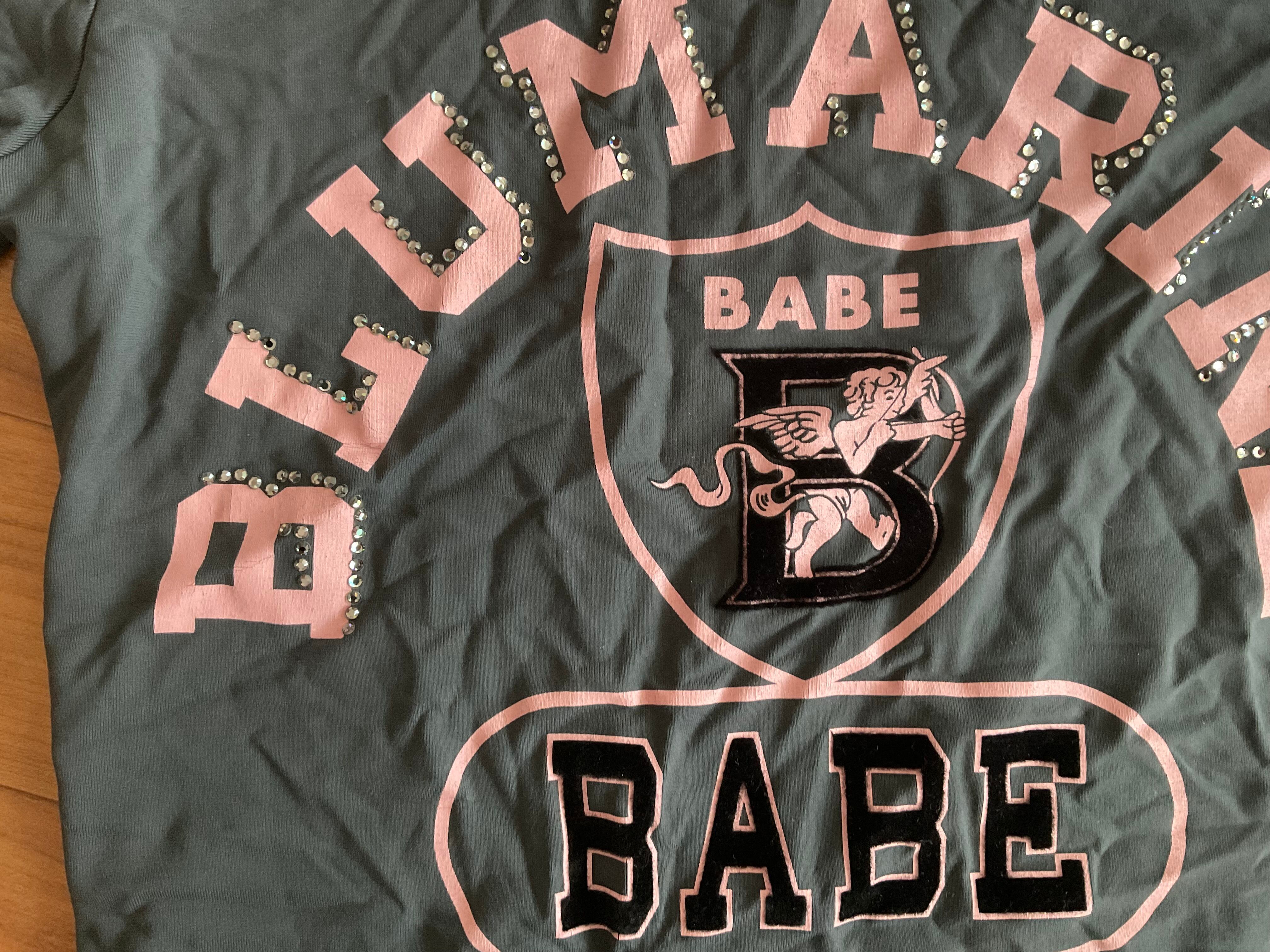 フロントには大きな「BABE」ロゴとエンジェル(キューピッド)モチーフがあしらわれ、ラインストーンが散りばめられた華やかなデザイン。Y2Kムードを感じさせる印象的な一着です。