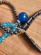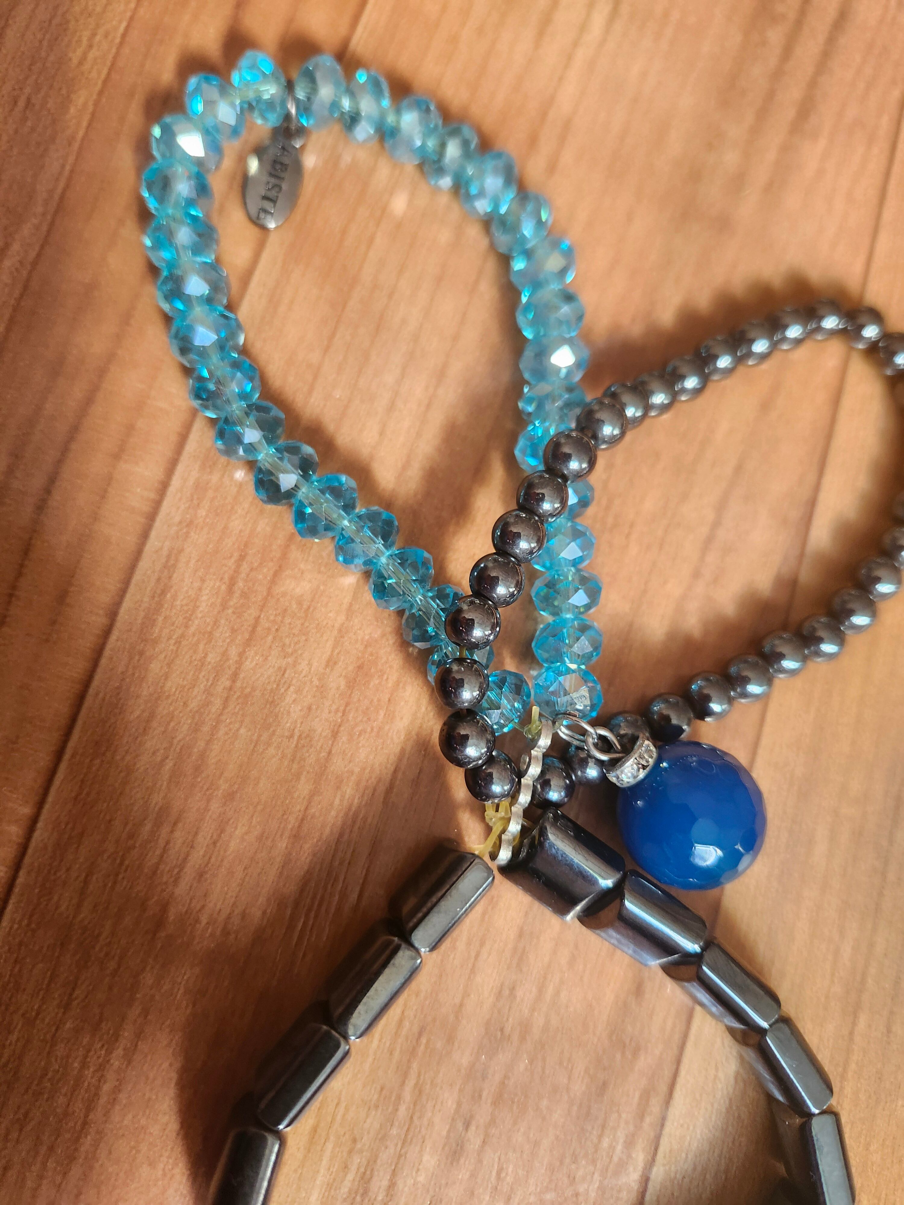 キラキラとしたスカイブルーのビーズ、クールなメタリックカラーのパーツ、そしてアクセントになる深みのあるブルーの大玉チャームが組み合わさった、非常にお洒落なデザインです。