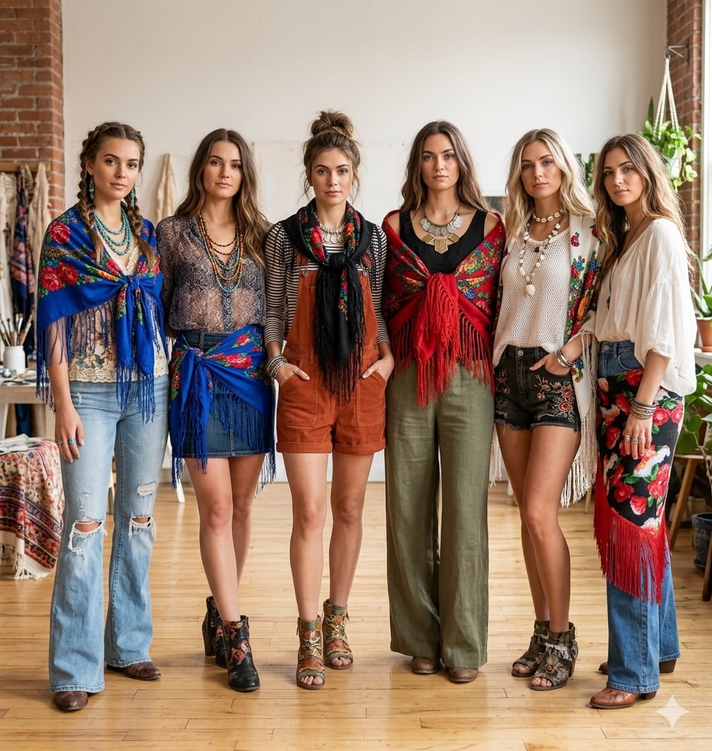 ボヘミアンスタイルのフリンジショール。コーディネートにアクセントを加え、シンプルな装いにも存在感をプラスします。ユニセックスで使用可能なデザインで、スタイルを選ばず幅広く活用できます。