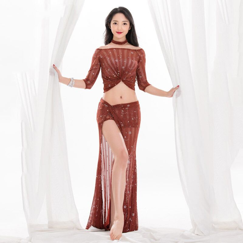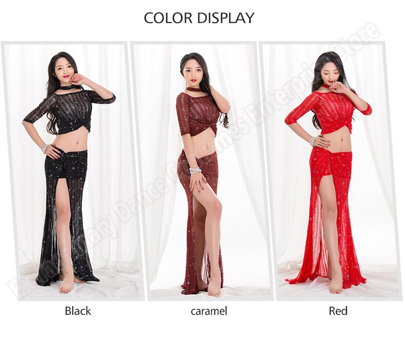 新ファッション女性ベリーダンストップスカートセクシーな衣装スパンコール練習服のスカートの分割東洋プロ 3 色