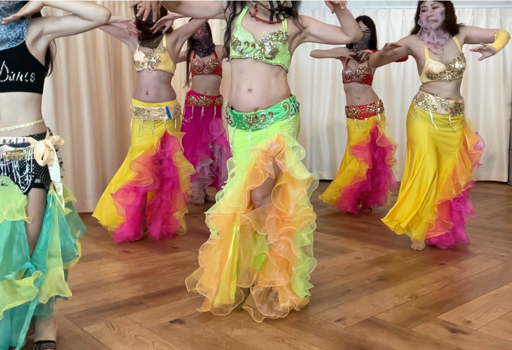 セット内容は、ブラ、ベルト、ロングスカート、アームアクセサリーの4点構成。装飾が揺れるデザインにより、踊りのラインや動きをより印象的に演出します。ソロパフォーマンスからグループ演目まで幅広く対応可能です。