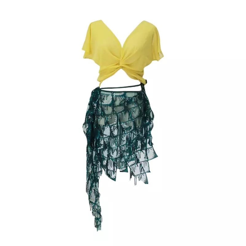 トップスとスカートの2ピースセットで、セクシーでエレガントなベリーダンスコスチュームです。練習用やパフォーマンス用に最適なデザインで、身に着けるだけで自信が湧いてきます。