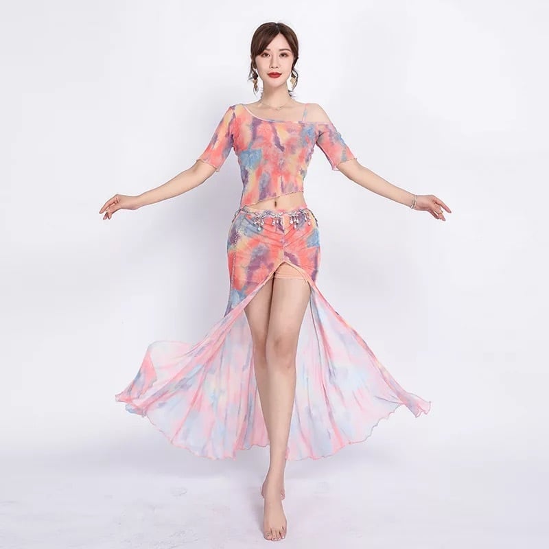 ベリーダンスレディースサマーセクシートップス+スカート+セーフティパンツ3枚プリントメッシュサイドオープンロングスカートオリエンタルダンスパフォーマンス練習着 | スターマガジン 美しい人のための美しい商品