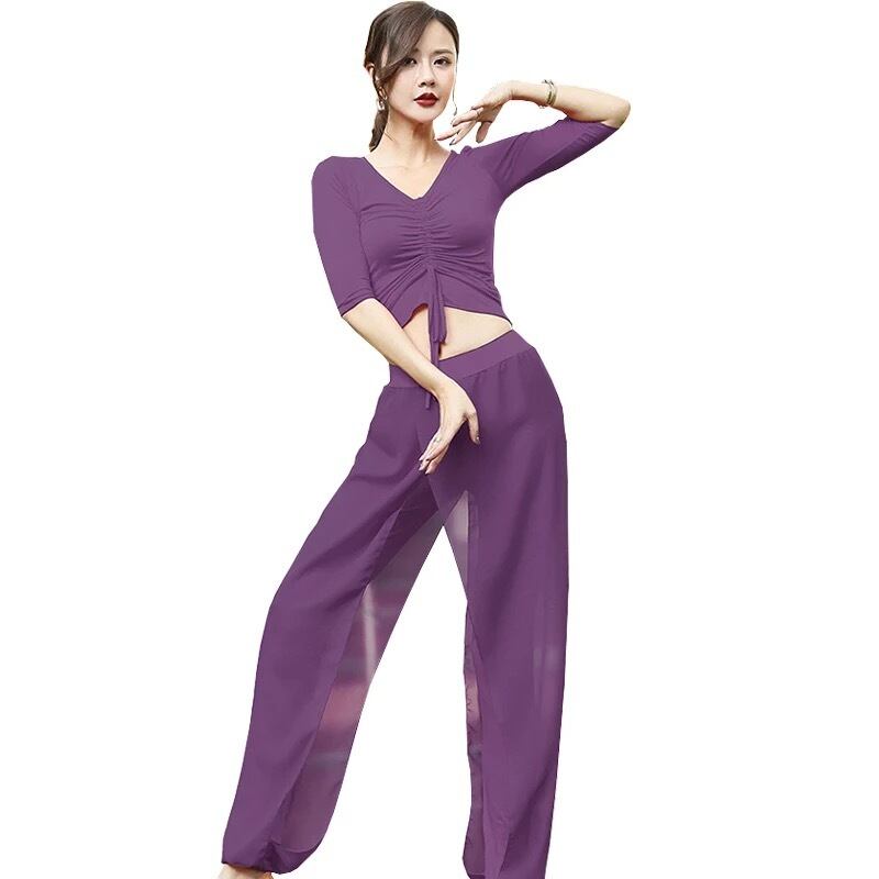 Vネックのセクシーなデザインが魅力的なベリーダンスヨガウェアスーツ。快適で動きやすい薄い素材を使用し、ベリーダンスやスポーツフィットネスエクササイズに最適です。ハイエンドなデザインで、華やかな舞台やクラスでも目を引くこと間違いなしです。