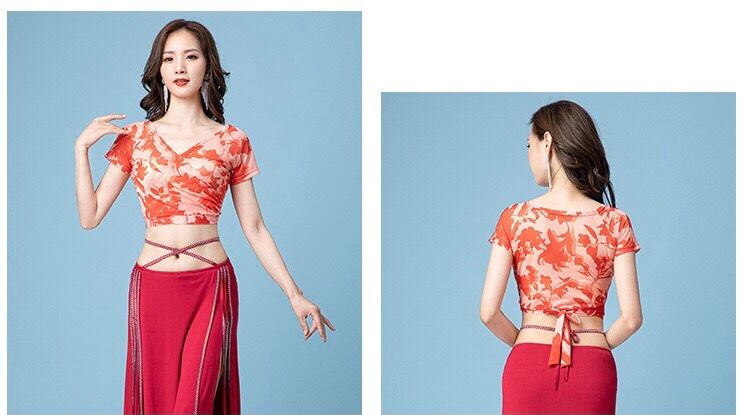 ベリーダンスやジプシーダンスのレッスンに最適な、シックでエレガントなブラウスです。スタイリッシュなプリントを施したデザインは、動きに合わせて華やかさを演出。舞台だけでなく、日常やレッスンでも使える万能アイテムです。