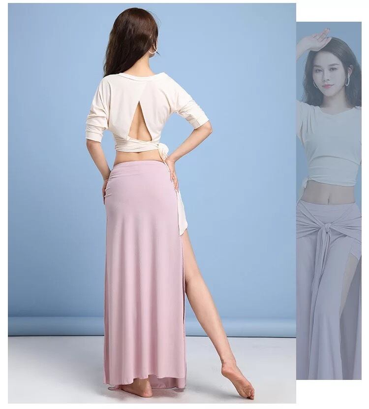 キャンディーカラーベリーダンストレーニングウェア伸縮性コスチュームセットクラスウェアガールズベリーダンス衣装2PCSトップスとロングスカート。華やかなカラーパレットと繊細なデザインで、ベリーダンスの魅力を存分に引き出します。