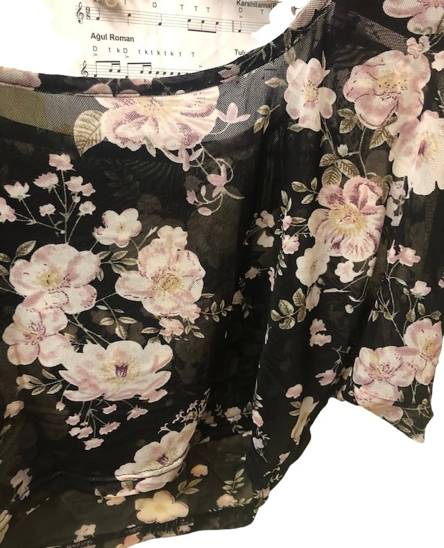 ベリーダンス教室用のダンスセットで、3つのアイテムで構成されています。 シフォンで作られたブラウス、シフォンインサート付きのモーダルで作られたスカート、モーダルで作られたショートパンツ。