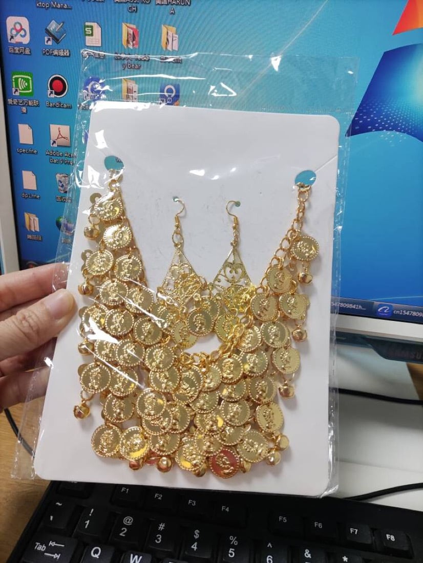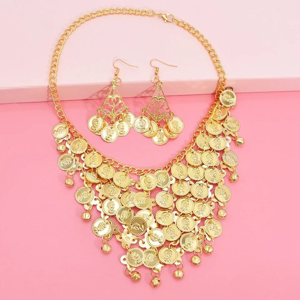 エキゾチックな雰囲気漂うベリーダンスジプシーセットが登場しました!ゴールデンカラーの合金を使用した幾何学的なデザインのネックレスとドロップイヤリングで、あなたの装いを一気に華やかに彩ります。