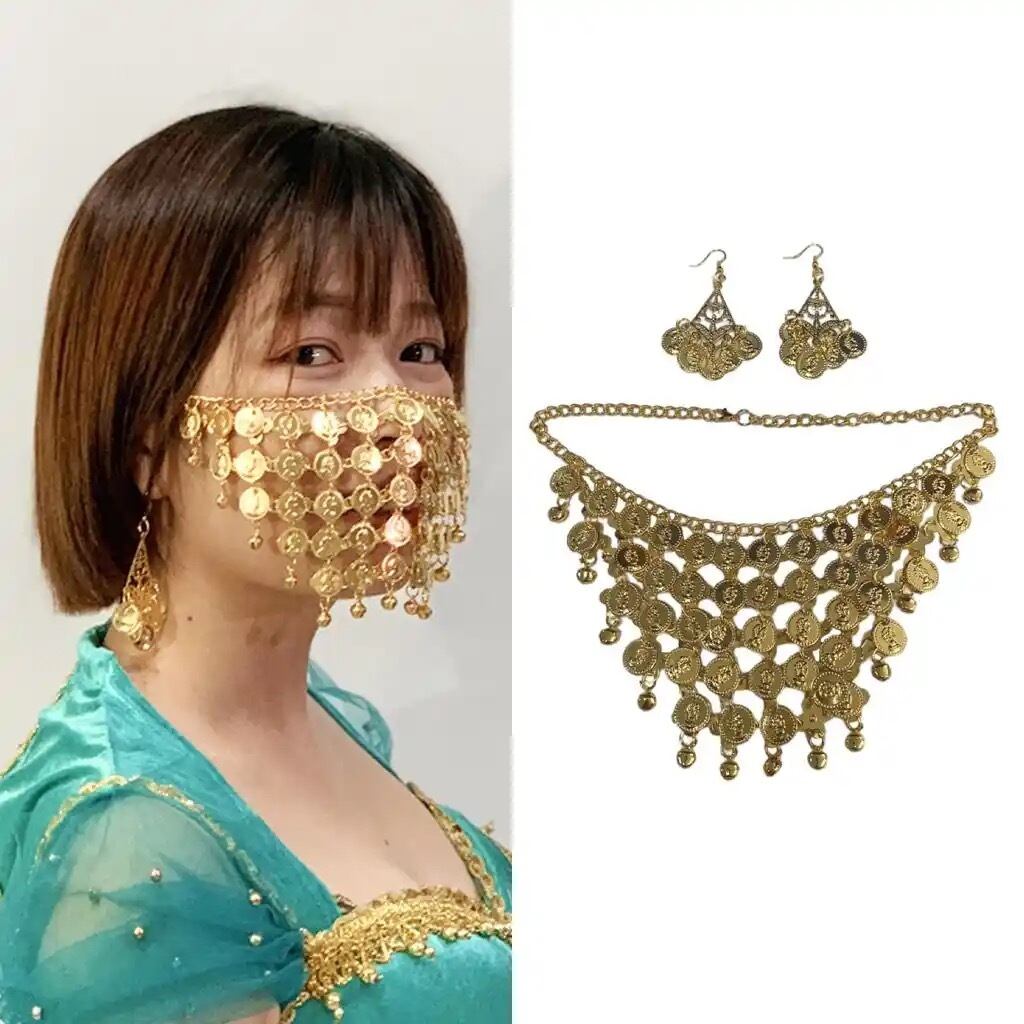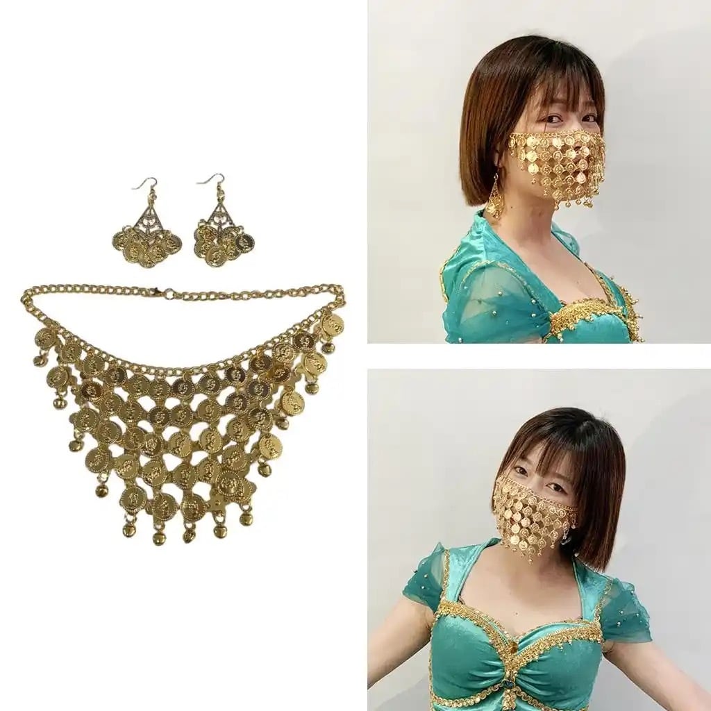 ダンス向けのこのアクセサリーは、#インド民族舞踊 や #ベリーダンス に使われる伝統的な#アクセサリー です。大ぶりの#ネックレス に多数の#フリンジ が付いていて、#イヤリング がセットになっています。ユニークなデザインのおかげで、#フェイスマスク としても使うことができ、踊りに#ミステリアス な#チャーミング な雰囲気を添えます。このような#ダンスアクセサリー は、#ゴールド や#シルバー で作られており、高品質の素材を使用しています。#ダンサー は、これを身に付けることで#東洋文化 の世界観に浸ることができ、#パフォーマンス や#コスプレ の際に動きの美しさを引き立てます。この#多機能アクセサリー は、#衣装 の素晴らしい#アクセント になり、印象的で記憶に残る#ステージ映え するルックスを作り出せるでしょう。
