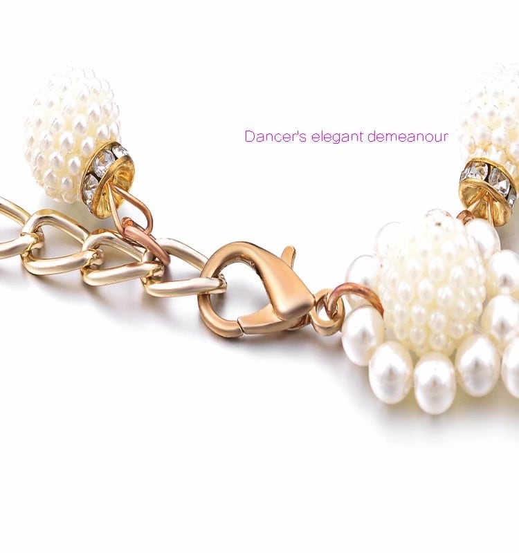 最後にウエストのフェイクパールチェーン。身につけるだけで、瞬時に上品さを演出してくれます。クラシックなデザインは、ステージ上での輝きを引き立てること間違いありません。