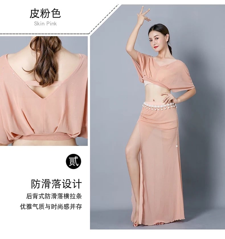 オリエンタルダンスを楽しむための完璧なトレーニングウェア3点セット。ロングスカート、アシンメトリーブラウス、ウエストにフェイクパールチェーンが付いています。優雅さを引き立てるデザインと上質な素材で、レッスンやショーで一緒に輝けること間違いなしです。