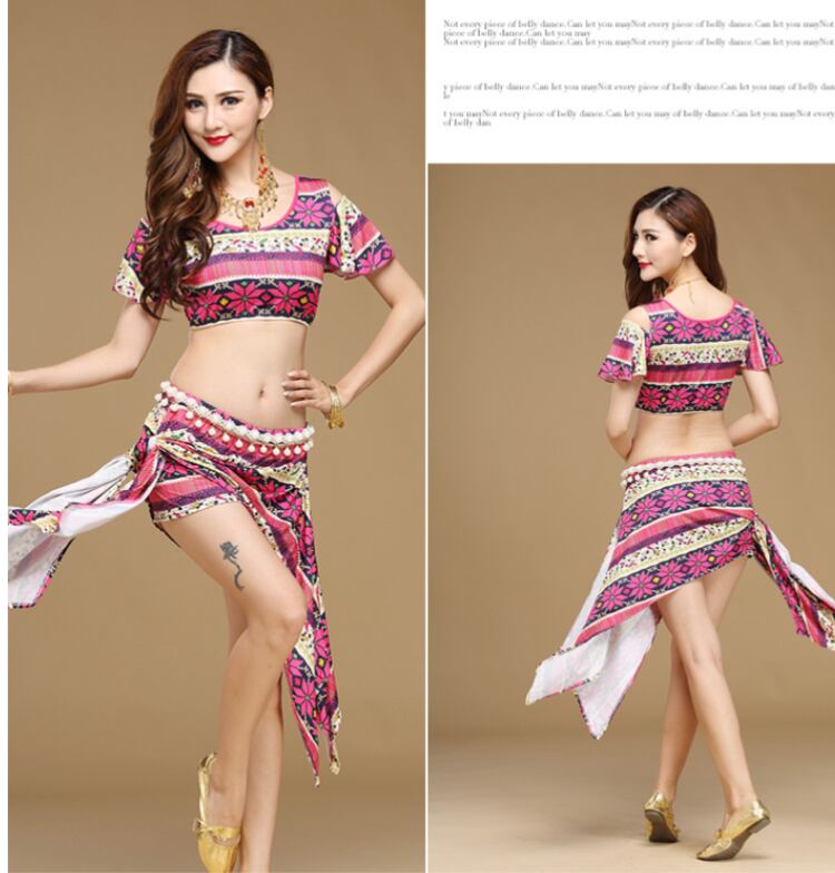 ベリーダンストレーニング2点セットコスチュームボリウッドラテンダンスのリハーサル練習用スーツ保護ショーツが縫い付けられた短いスカート半袖トップ