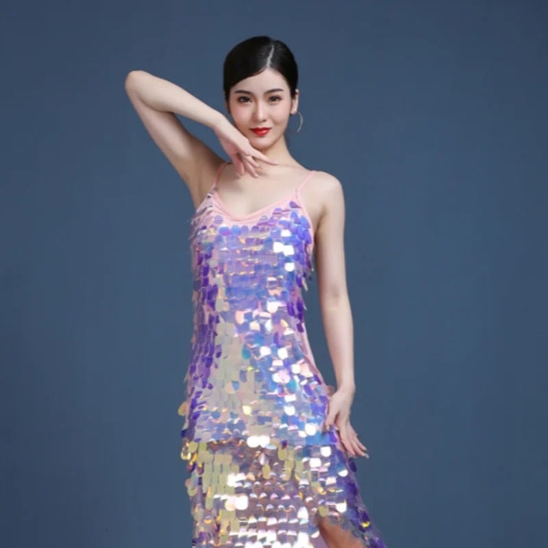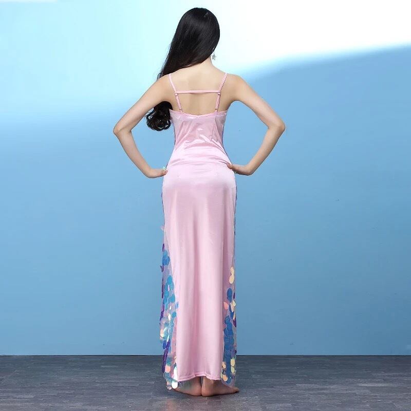 伸縮性のあるサテン生地をベースに、柔らかく伸縮性のあるブリンク ロング ドレスです。透明なうろこ状のスパンコールで、とてもきれいです。そんなストラップワンピース、背中に調節可能なストラップ、サイドスリット。セットにはドレス(アンダーショーツを含む)が含まれ、ベリーダンスのクラスウェアやステージパフォーマンスに最適です。