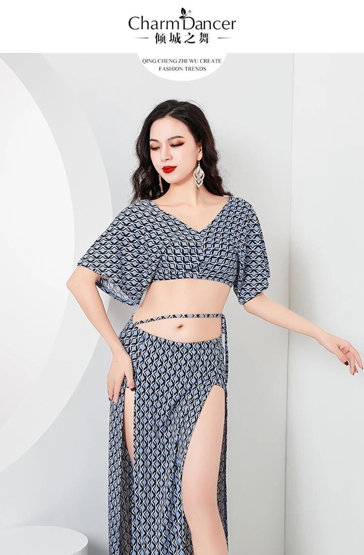 ベリーダンスプロフェッショナルスーツ女性半袖トップ+スカート2個セット。オリエンタルなデザインで、ベリーダンスを華やかに演出します。トップは半袖で肩や背中が露出し、女性らしいシルエットを作ります。スカートはギャザーが施され、動きに合わせて揺れる様子が美しいです。