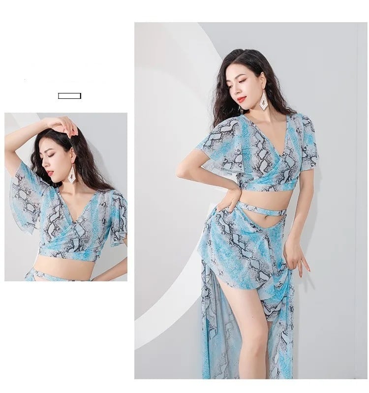 ベリーダンスセクシーなダンスコスチュームガーゼプリントベリーダンス服2点セットパフォーマンス衣装半袖オリエンタルメッシュスカート新しいエレガントな大人