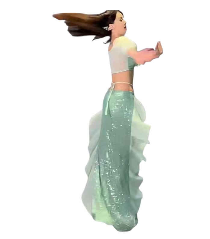 上質なシフォン素材を使用したロングスカートは、軽やかに広がるシルエットが特徴。回転や移動の動作に合わせて自然な流れを生み出し、ステージ上での表現力を高めます。