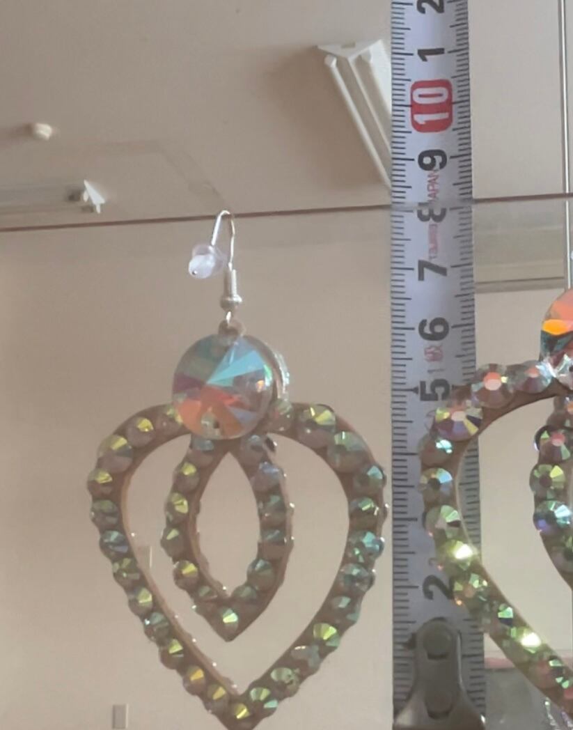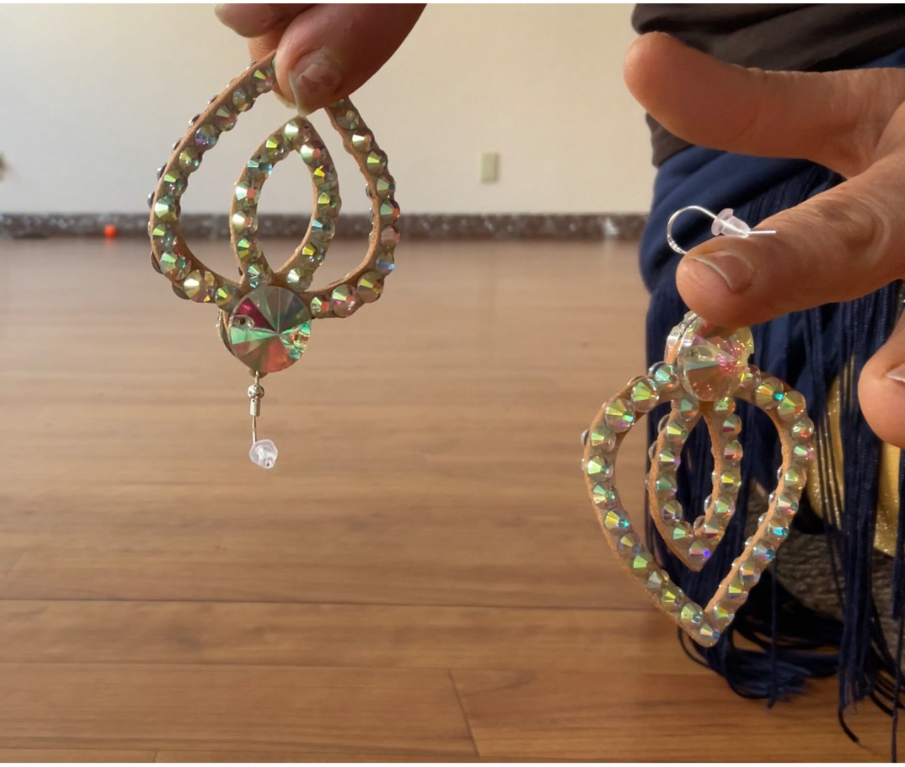 シックなハンドメイドピアスは、大きいサイズでも軽くて髪に絡まないので、ダンスやターンの際に頭を回すのにとても便利です