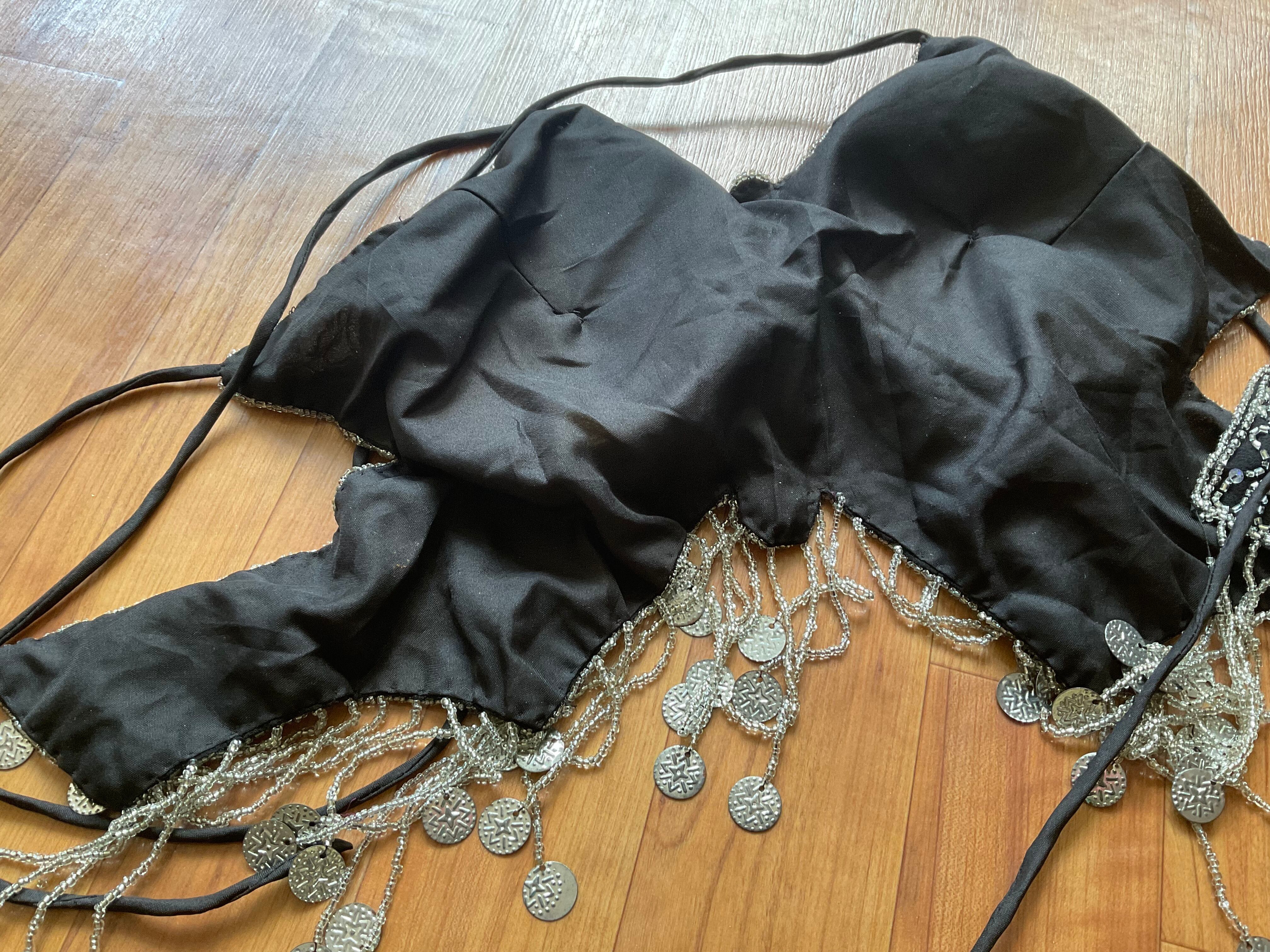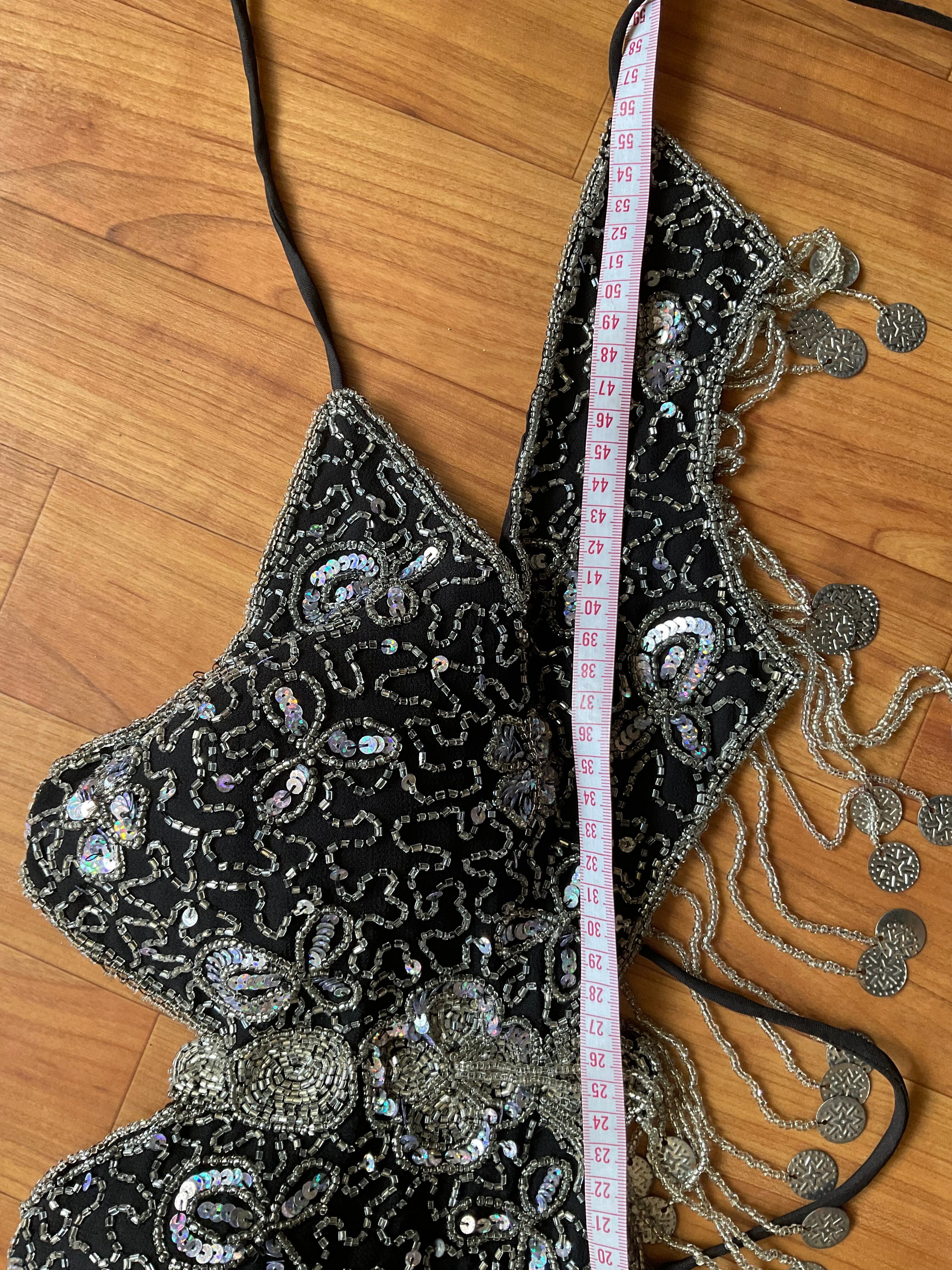 商品名:中古ベリーダンス衣装 ビーズ刺繍ゴージャスベリーダンスブラカバー&ヒップスカーフセット 黒