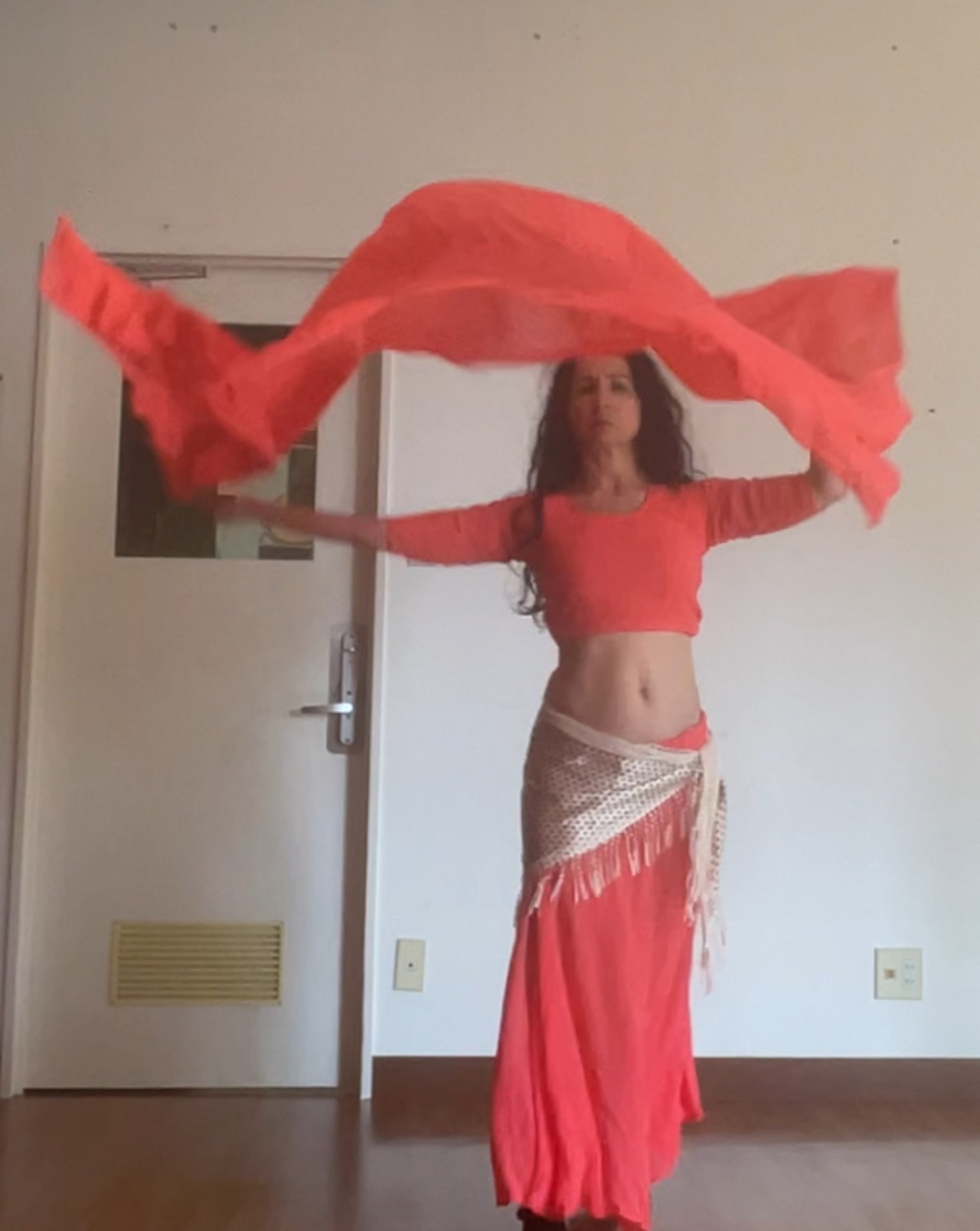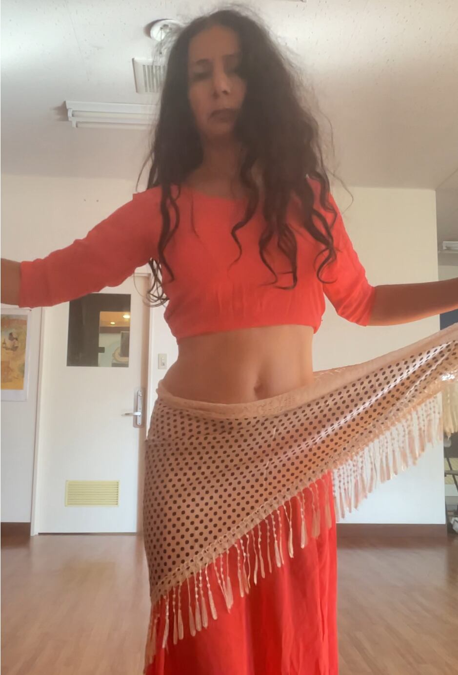 シフォンショールとのセットです。このショールはやや重いため、古典的なアラビアダンス用ではありませんが、腰の包帯やサリーとしてフォークダンスに最適です。しかし、シフォンの厚手のおかげで、このショールはベリーダンスのベルとして初心者のダンサーのトレーニングに最適です