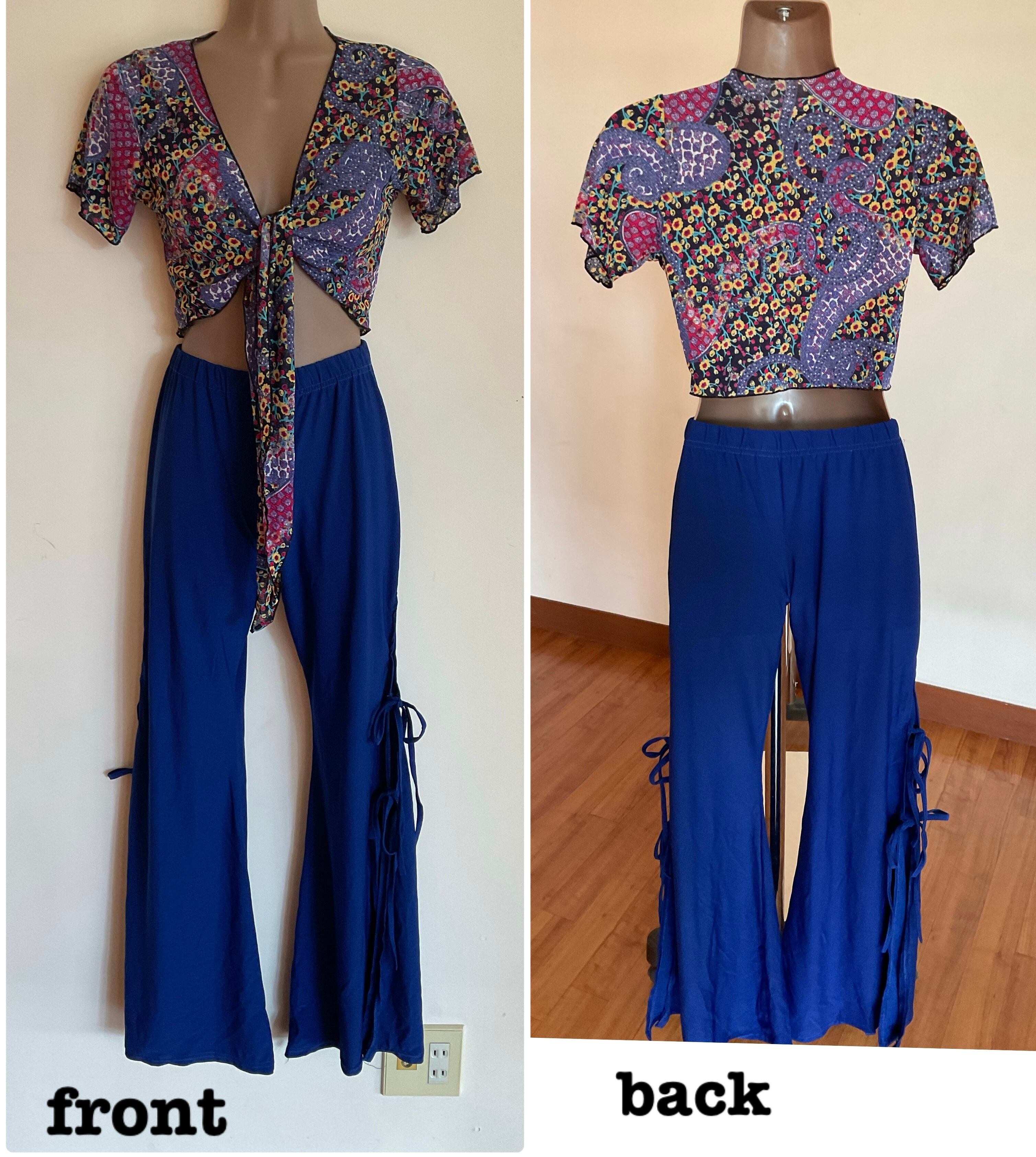 このダンスウェアセットは、柔らかな生地で作られており、動きやすさと快適さを兼ね備えています。ジプシーチョリはカジュアルにも合うデザインで、フレアパンツも流れるようなシルエットが魅力です。具体的なサイズや詳細は、写真をご参照ください。